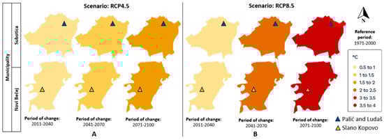 (A) Future climate projections (changes) for daily average temperature for the three periods, 2011–2040, 2041–2070, and 2071–2100 with a reference period of 1971–2000 for the scenario RCP4.5 (mitigation); (B) future climate projections (changes) for daily average temperature for the three periods, 2011–2040, 2041–2070, and 2071–2100 with a reference period of 1971–2000 for the scenario RCP8.5 (no mitigation); based on data from the Digital Climate and Climate Change Atlas of the Republic of Serbia [49].