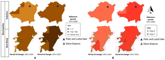 (A) Observed SPEI drought index changes for the two periods, 2001–2020 and 2011–2020, with a reference period of 1971–2000; (B) observed days with temperatures above 35 °C changes for the two periods, 2001–2020 and 2011–2020, with a reference period of 1971–2000; based on data from the Digital Climate and Climate Change Atlas of the Republic of Serbia [49].