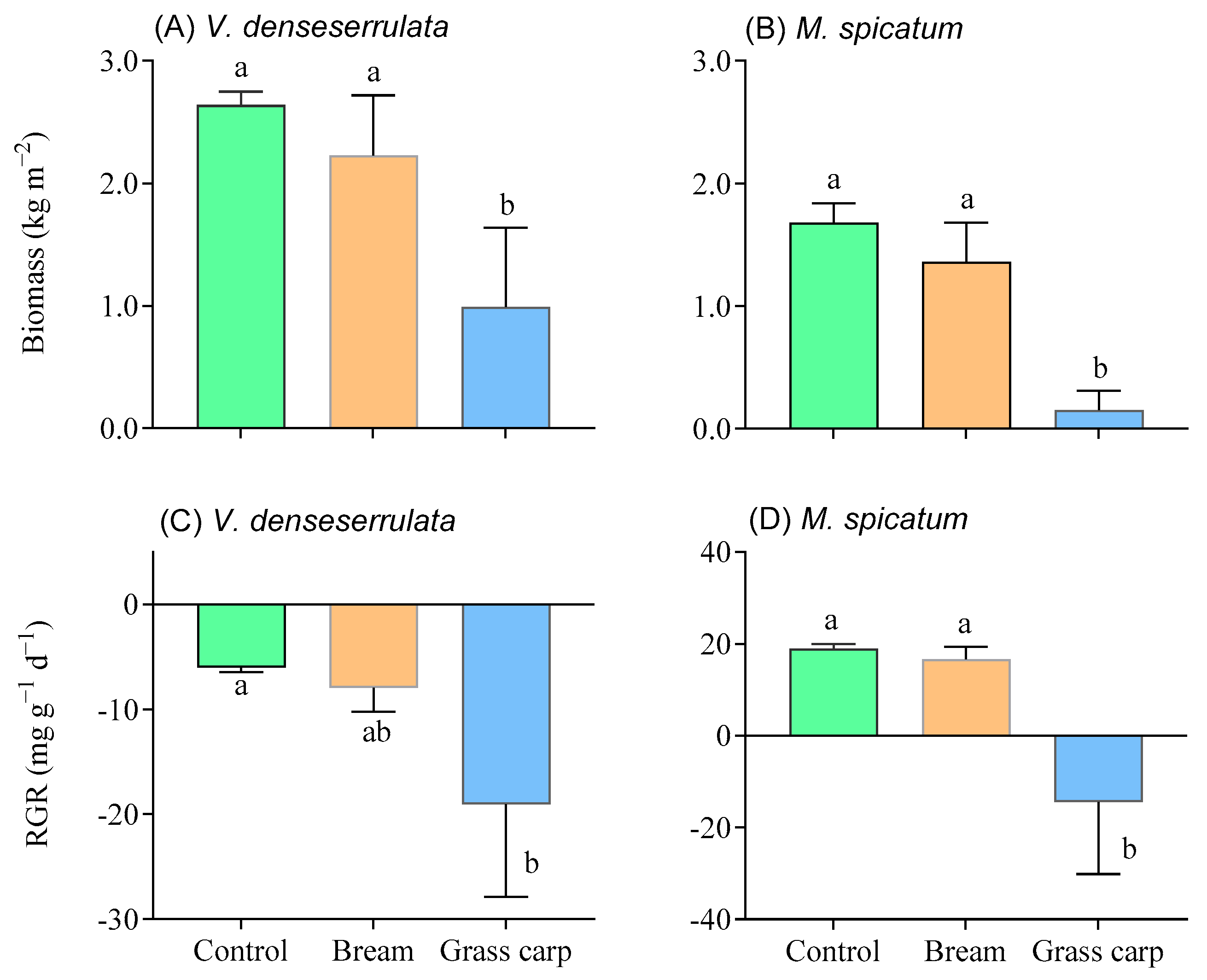 Zhen W, Zhang X, Lin Z, Gao Y, Wang Q, Yang K, Guan B, Li K, Jeppesen E, Liu Z, et al. Effects of Herbivorous Fish on Competition and Growth of Canopy-Forming and Meadow-Forming Submerged Macrophytes: Implications for Lake Restoration. Water. 2026; 18(1):28. https://doi.org/10.3390/w18010028