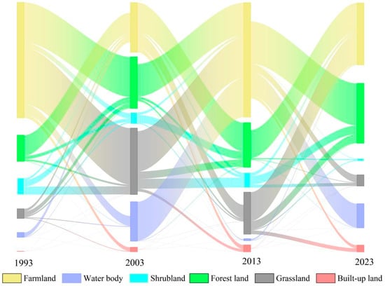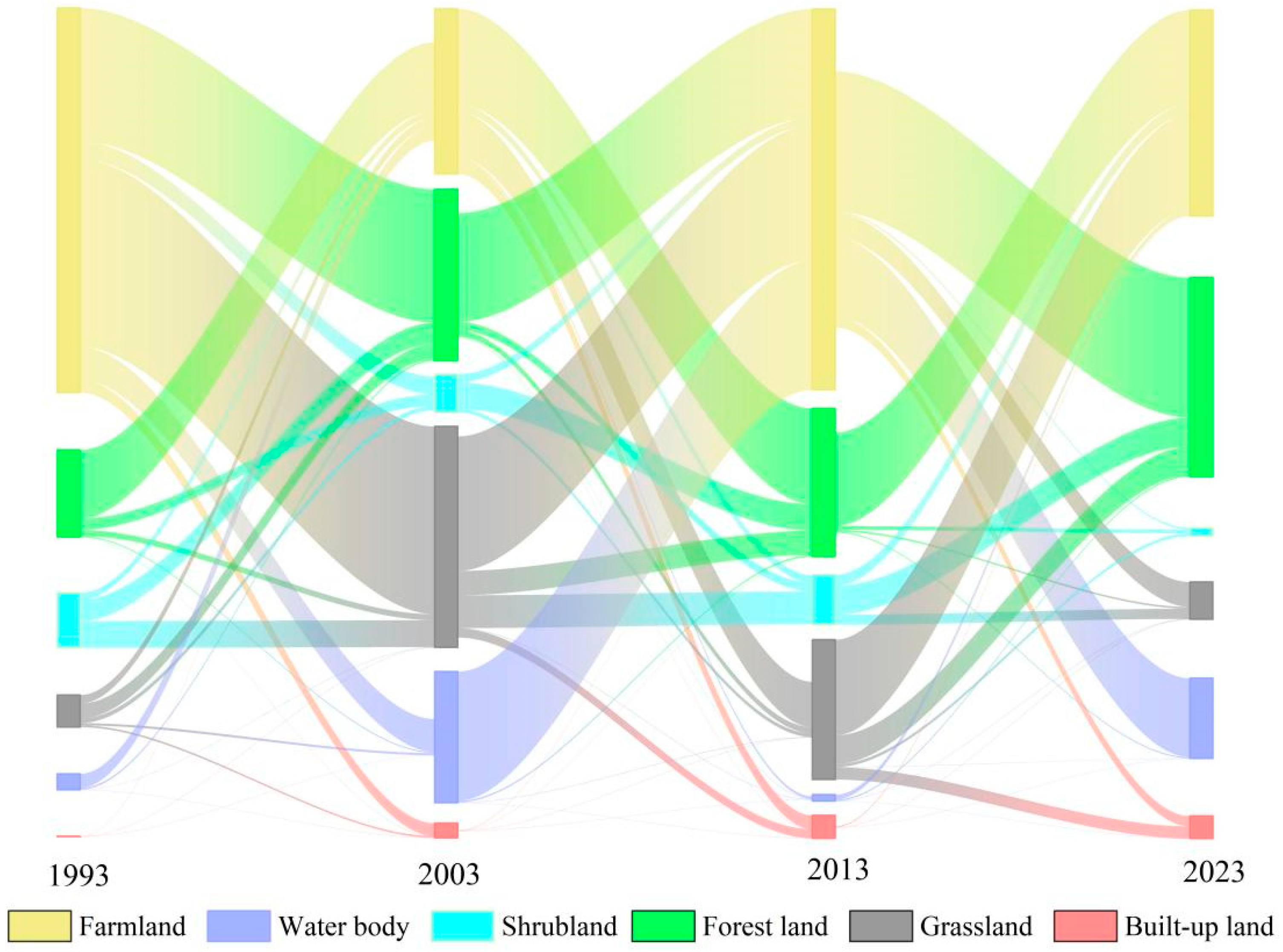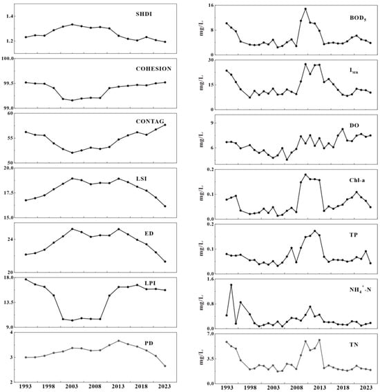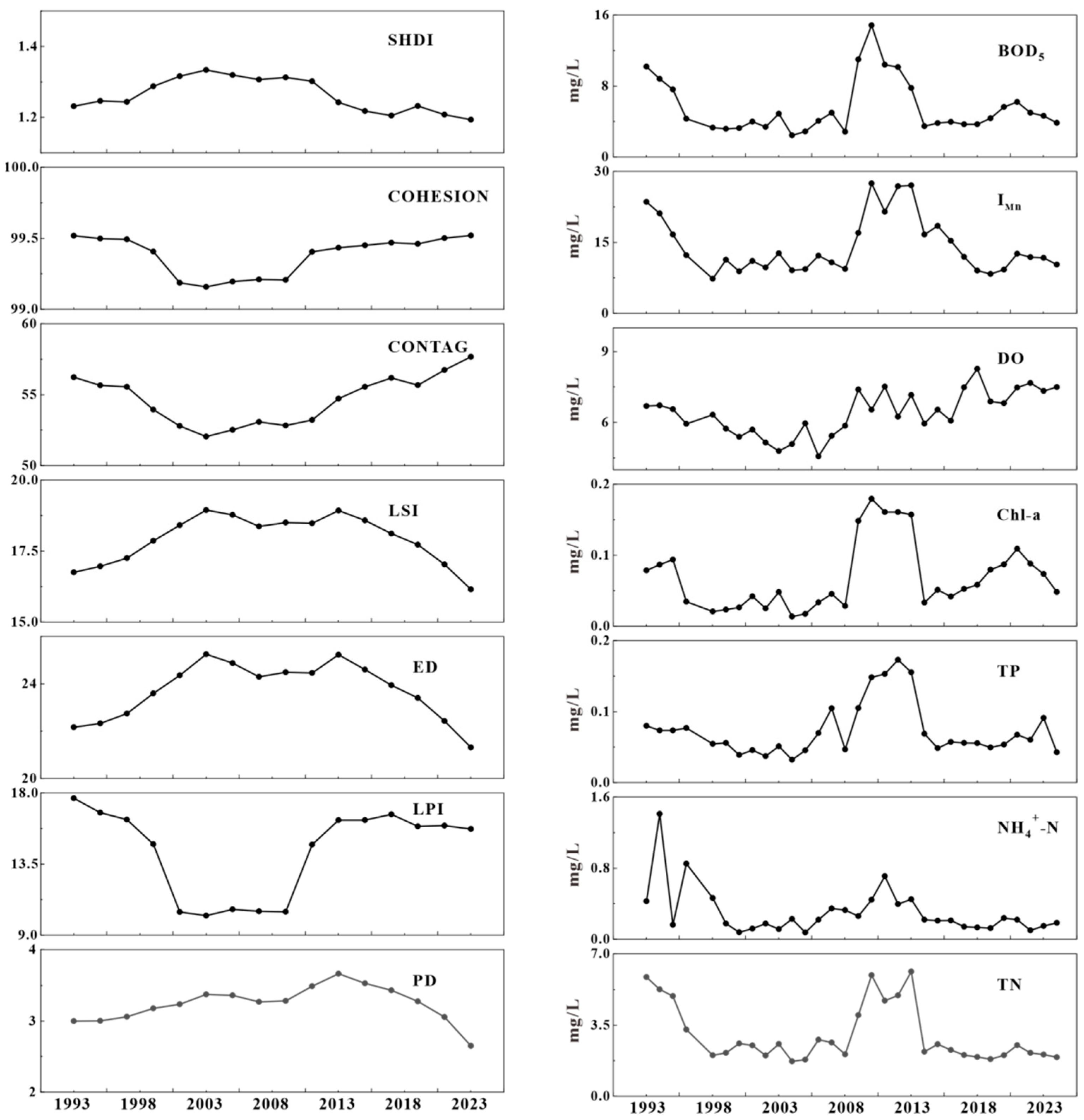 - From 1993 to 2023, land use in the Yilong Lake Basin changed notably: farmland, shrubland, grassland, and water areas decreased, while forest land and built-up land expanded, especially the latter. The patch density slightly declined, but the landscape connectivity and heterogeneity improved. The water quality also changed, where TN, TP, Chl-a, and NH4+-N decreased overall, DO increased, and IMn and BOD5 showed opposite trends. These shifts suggest that eutrophication was mitigated, and the land use change had complex impacts on water quality.
