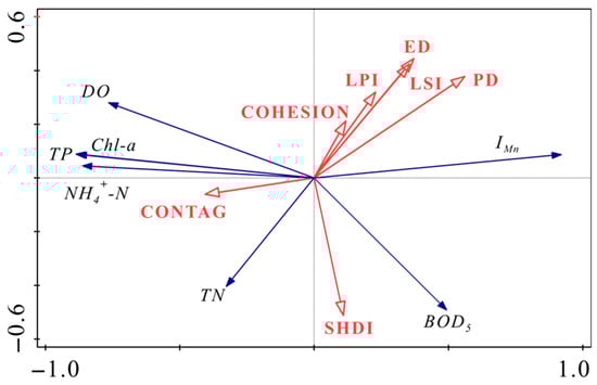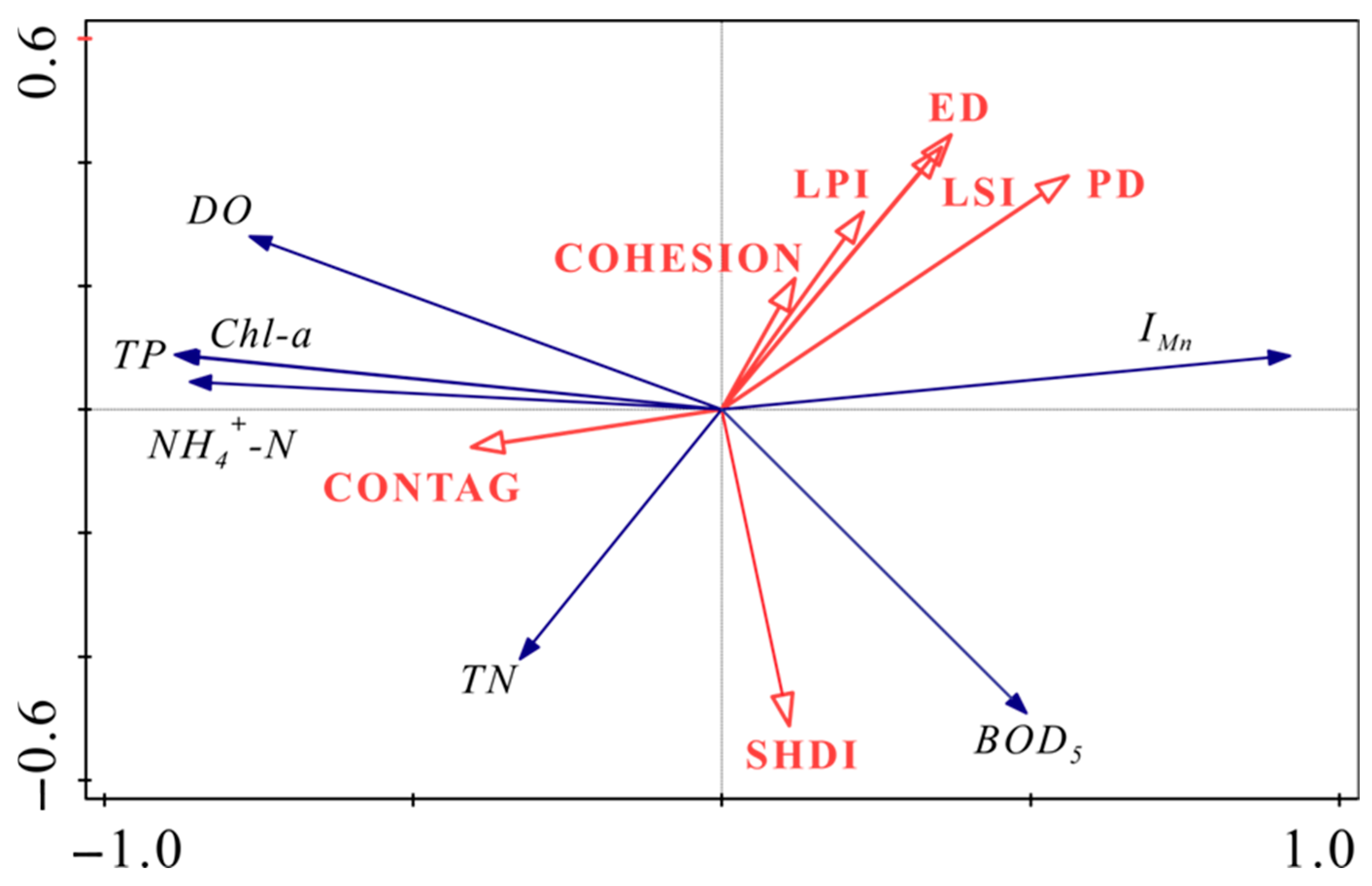 - Landscape patterns strongly influenced the water quality. The RDA showed that the LPI, ED, and LSI were positively correlated with IMn and negatively with TN, TP, NH4+-N, and Chl-a. The PD showed similar trends but was negatively correlated with DO and positively with BOD5. In contrast, CONTAG was positively correlated with most indices and negatively with BOD5. These results indicate that enhancing ecological connectivity may improve the water quality, while a higher patch density and heterogeneity may worsen it.