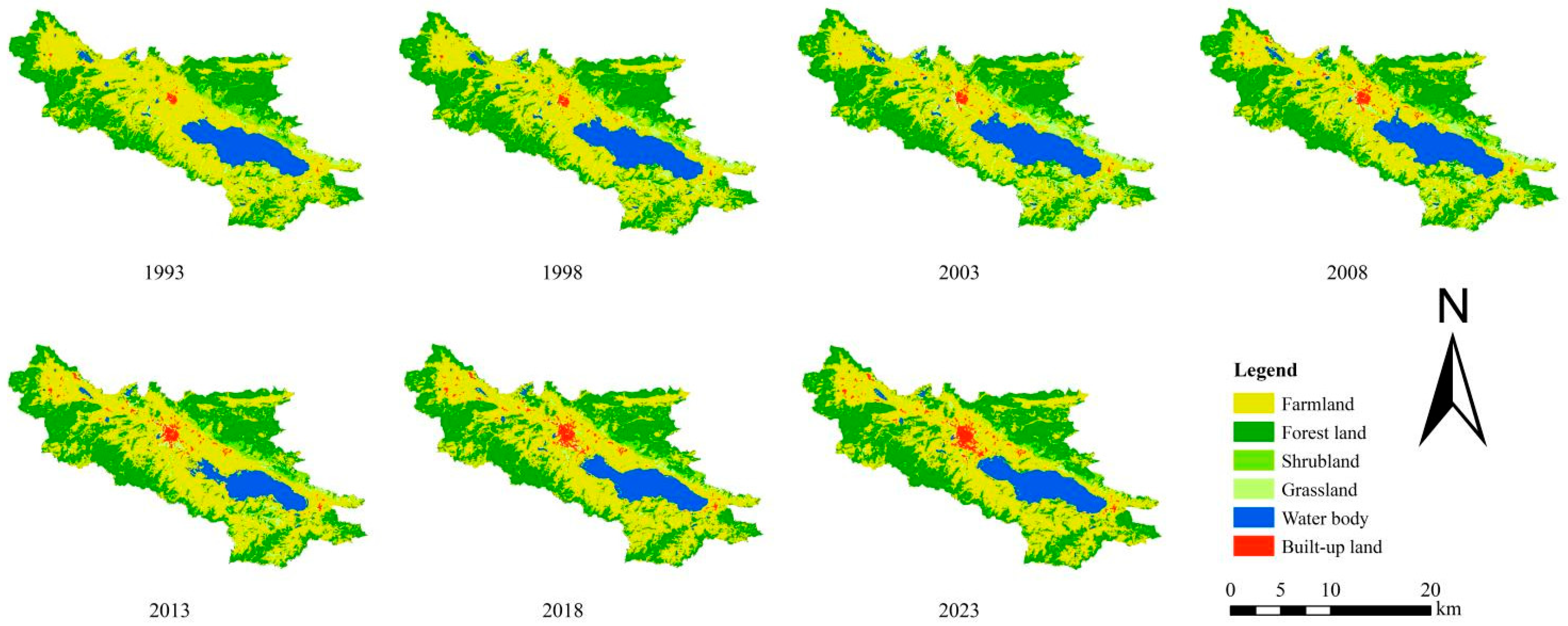 - Yang, J. The 30 m Annual Land Cover Datasets and Its Dynamics in China from 1985 to 2023. Zenodo. 2024. Available online: https://www.ncdc.ac.cn/portal (accessed on 15 March 2025).