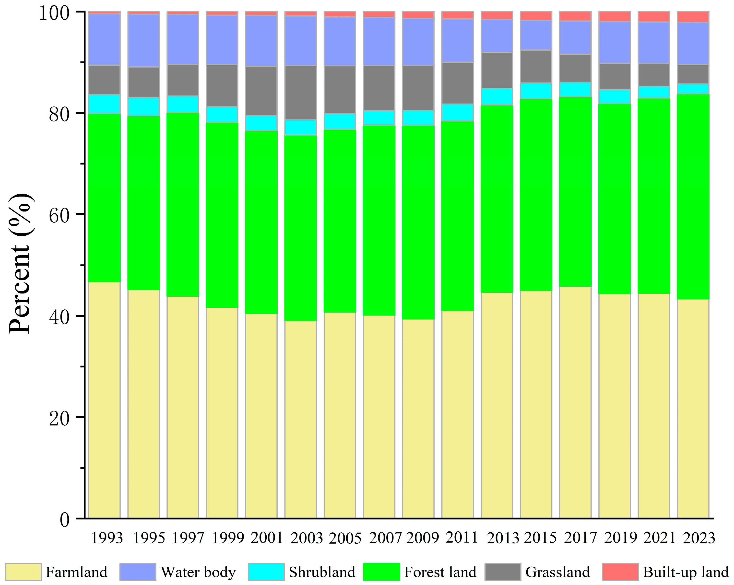 - Over the past 30 years, ecological management reduced TN, TP, NH4+-N, Chl-a, IMn, and BOD5, but increased DO. Yet, urbanization still affected the water quality. Built-up land expanded rapidly, which increased the patch density; the loss of shrubland and grassland weakened filtration, which raised the runoff risks. The forest land expansion helped, but urban growth added new pollution sources. As most forests lie far from the lake, their purification role is limited. In general, the improvement of water quality in the Yilong Lake Basin was due to the reduction in farmland and the increase in forest lands, but the expansion of built-up land may pose a threat to water quality.