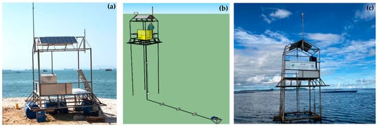 The GOT001 marine telemetry station was designed for continuous offshore monitoring at the Si Racha Fisheries Research Station. The system consisted of a stainless–steel structure mounted on a concrete base and installed approximately 1.5 km offshore in Si Racha District, Chonburi Province, at a water depth of 6–7 m (13°09′50.98″ N, 100°54′23.12″ E) (Figure 1). The station comprised upper and underwater mounting sections that housed meteorological, hydrographic, and biological sensors. All instruments were connected to a data logger and transmitted data via an Internet-based telemetry system: MaxiMet GMX 501 (Gill Instruments Co., Ltd.; Lymington, Hampshire, United Kingdom) measured AIRTEMP, DEWPOINT, PRECIP, PRESSURE, RH, WINDDIR, WINDSPD, and SOLAR; Infinity–CTW (JFE Advantech Co., Ltd.; Nishinomiya, Hyogo, Japan) measured COND, SAL, and SEATEMP; Rinkow–w (AROW2) (JFE Advantech Co., Ltd.; Nishinomiya, Hyogo, Japan) measured DO, DOSAT; Infinity–CLW (JFE Advantech Co., Ltd.; Nishinomiya, Hyogo, Japan) measured TURB; Nortek AWAC 1 MHz measured Hsig, Hmax, CURDIR, CURSPD, TP, WAVEDIR, WLEVEL; Digital pH sensor (Aqualabo; Champigny–sur–Marne, France) measured pH; Infinity–CLW (JFE Advantech Co., Ltd.; Nishinomiya, Hyogo, Japan) measured Chl–a (Table 1).