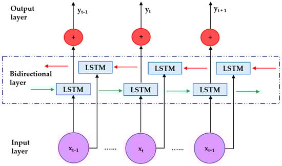 BiLSTM architecture comprising an input layer, a bidirectional layer, and an output layer. Each time step in the input layer (xt−1, xt, xt+1) is fed into both the forward LSTM (green arrows) and the backward LSTM (red arrows). The results from both directions are combined (blue boxes) and then sent to the output layer (yt−1, yt, yt+1), respectively.
