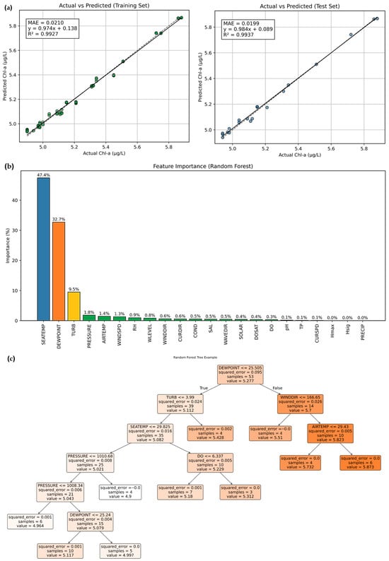 Feature selection for Chl-a prediction used meteorological, hydrochemical, and biological data from the first two years of the record, which contained the most complete observations across parameters. The RF regressor showed close agreement between predicted and observed Chl-a within the range of approximately 4.8–5.8 µg/L (Figure 5) and yielded low errors for both the training set (MAE = 0.021) and the test set (MAE = 0.019).