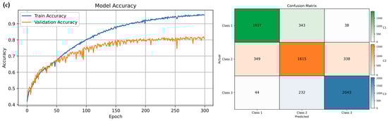 Left: accuracy and loss curves across epochs for the training and validation datasets. Right: confusion-matrix heat maps at the best epoch for test–set Chl-a classes and overall accuracy: (a) CNN–LSTM, (b) CNN–BiLSTM, and (c) CNN–BiLSTM–Attention.