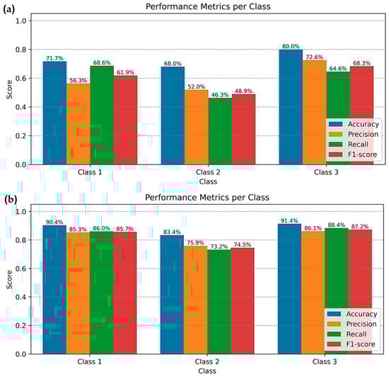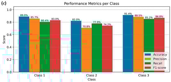 Performance metrics per class, including accuracy, precision, recall, and F1–score, for Chl-a classification obtained from the best fine-tuned models: (a) CNN–LSTM (400 epochs), (b) CNN–BiLSTM (300 epochs), and (c) CNN–BiLSTM–Attention (300 epochs). All metrics are dimensionless ratios by definition; however, they are reported as percentages to facilitate interpretation and comparison across classes. The apparent inconsistency between the class-wise performance ranking in panel (a) and the corresponding confusion matrix in Figure 7a arises from the definition of class-wise accuracy, which is computed using a one-vs-all approach. As a result, this metric reflects not only correctly classified samples of the target class but also true negatives from the remaining classes, rather than relying solely on the diagonal elements of the confusion matrix.