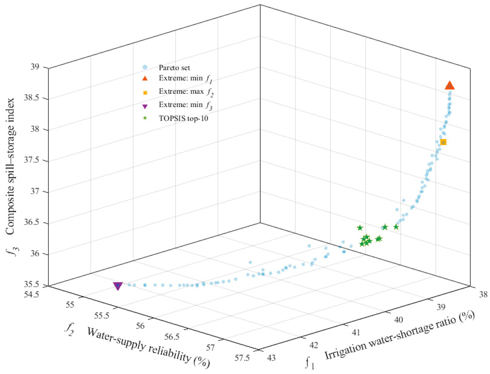 - Entropy-weighted TOPSIS analysis shows that irrigation shortage and spill-storage performance are the main factors distinguishing alternative schemes, while reliability varies only weakly within the Pareto front. High-ranking schemes, therefore, exhibit relatively low irrigation shortages and small spill-storage deviations, with only modest differences in overall reliability. For the preferred compromise scheme, the annual irrigation water-shortage ratio is about 39% of the total annual demand, the mean satisfaction level of irrigation and ecological requirements is about 57%, and the composite spill-storage index remains at a comparatively low level, indicating a reasonably balanced trade-off among shortage control, supply stability and reservoir-operation efficiency.