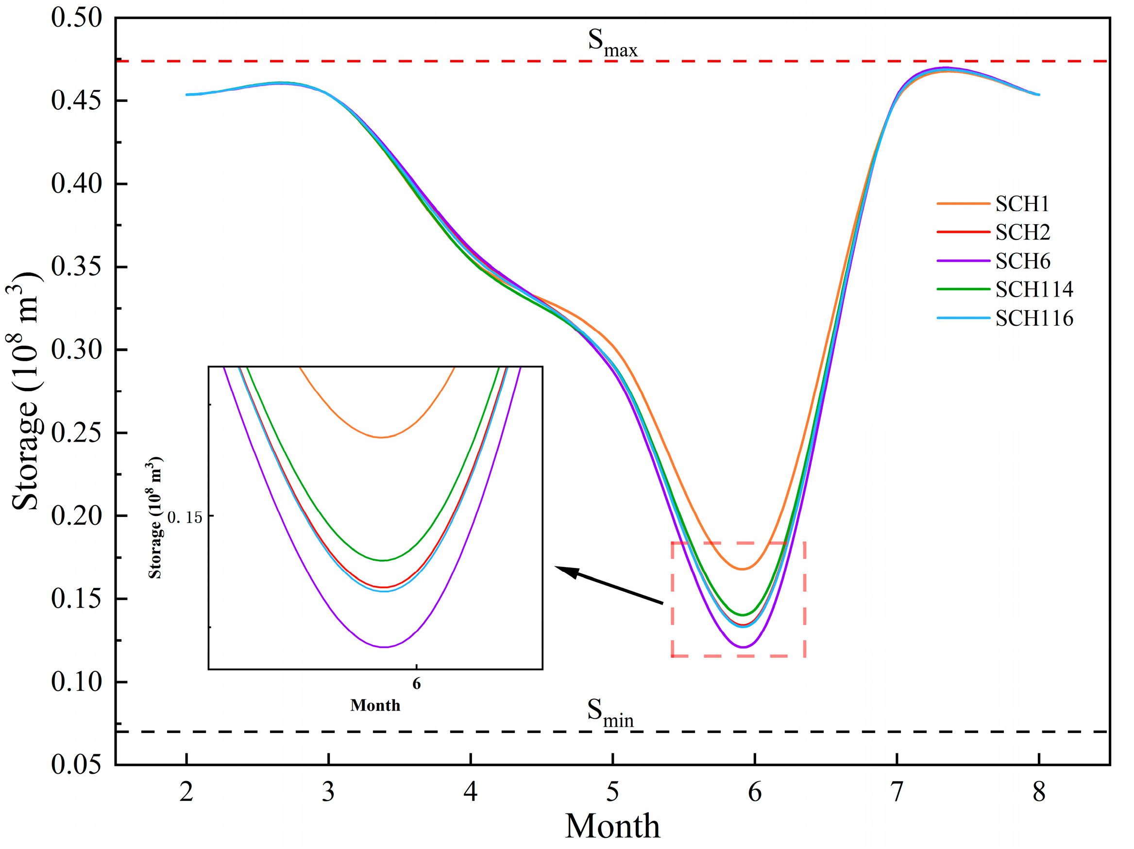 - The joint-operation results reveal distinct operational philosophies among representative schemes, including water-saving, reliability-oriented and compromise strategies. Water-saving schemes strengthen storage control but may increase the risk of spill losses or underutilization, whereas reliability-oriented schemes stabilize water supply at the expense of larger spill and storage deviations. The compromise scheme moderates extremes in all three objectives, highlighting the inherent competition between irrigation supply, ecological baseflow maintenance and storage security and providing targeted scheduling pathways for different management priorities.