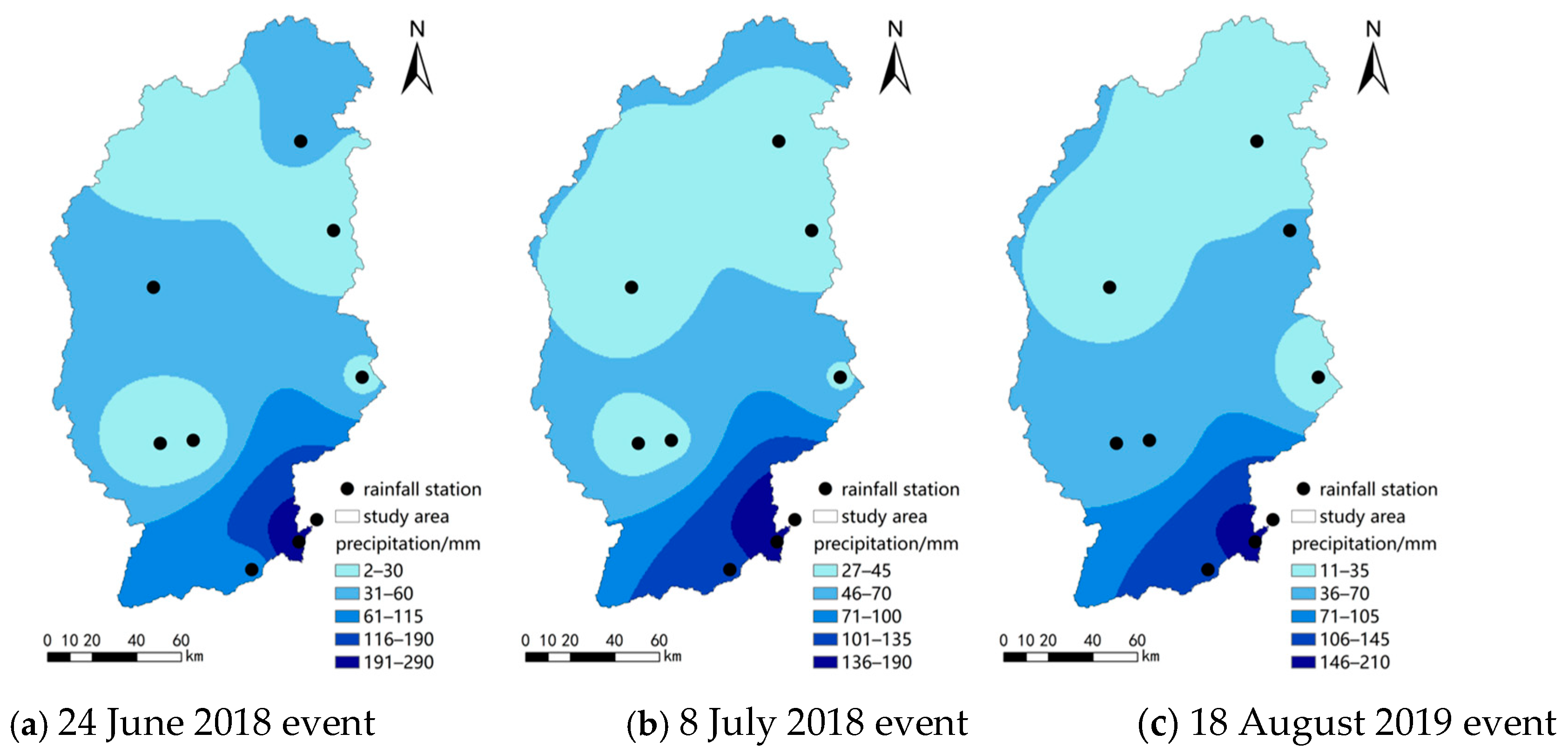 | Rainfall Events | Timing of Rainfall (Beijing Time) | Duration/h | Initial Filed Type | Data Resolution | Test ID |