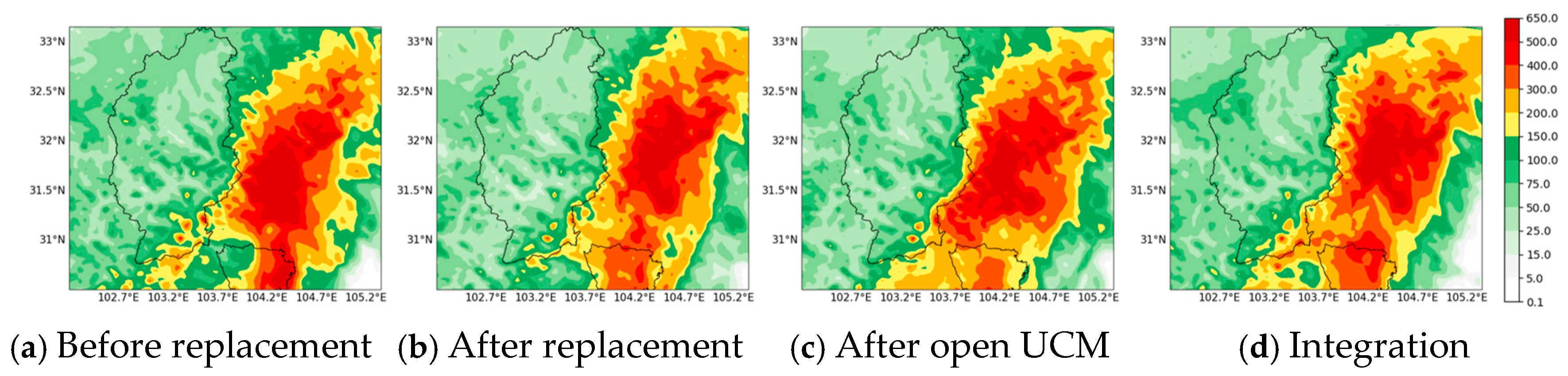 - Pei, Y.; Liu, J.; Wang, J.; Mei, C.; Dong, L.; Wang, H. Effects of urbanization on extreme precipitation based on Weather Research and Forecasting model: A case study of heavy rainfall in Beijing. J. Hydrol. Reg. Stud. 2024, 56, 102078. [Google Scholar] [CrossRef]