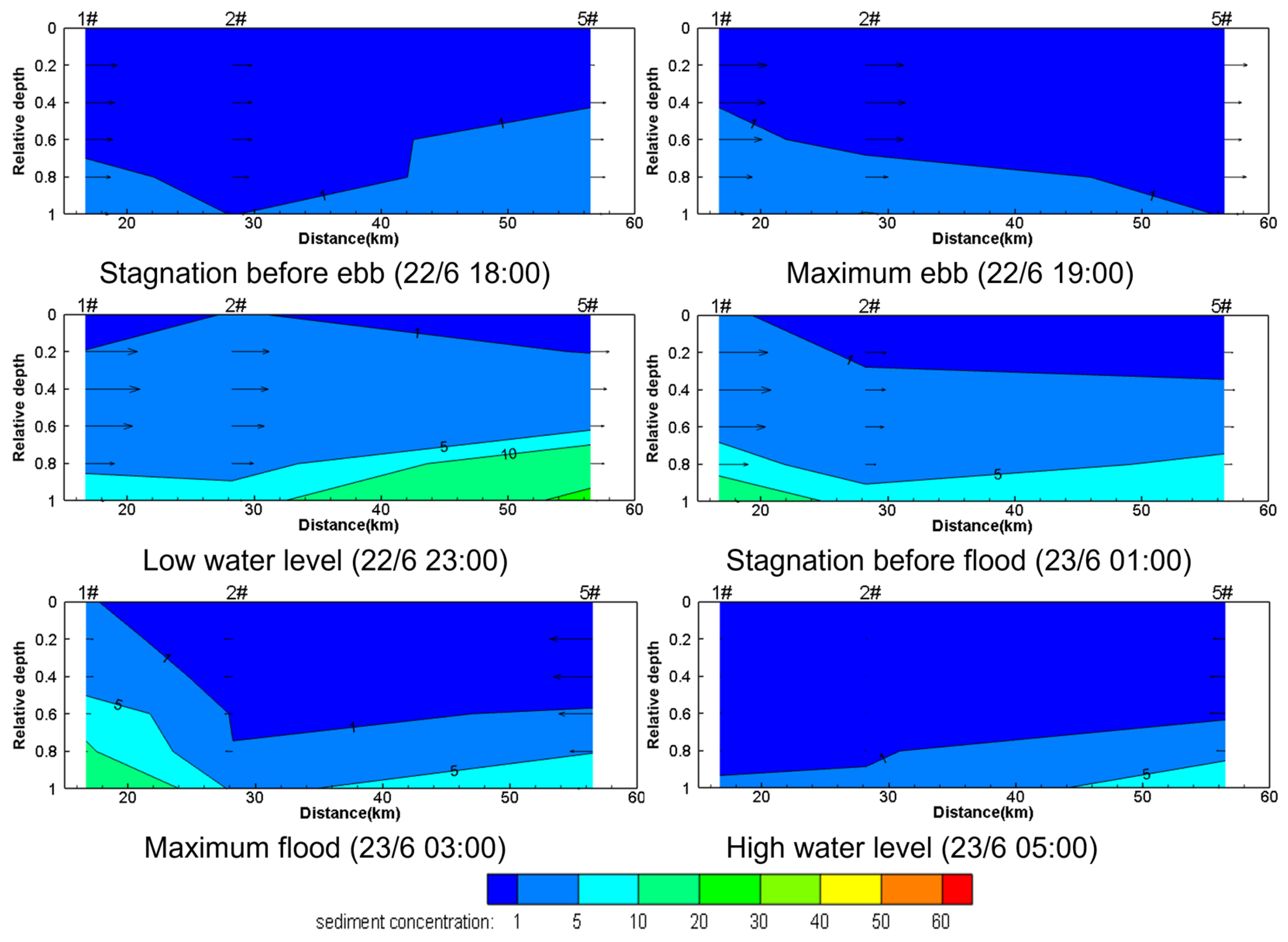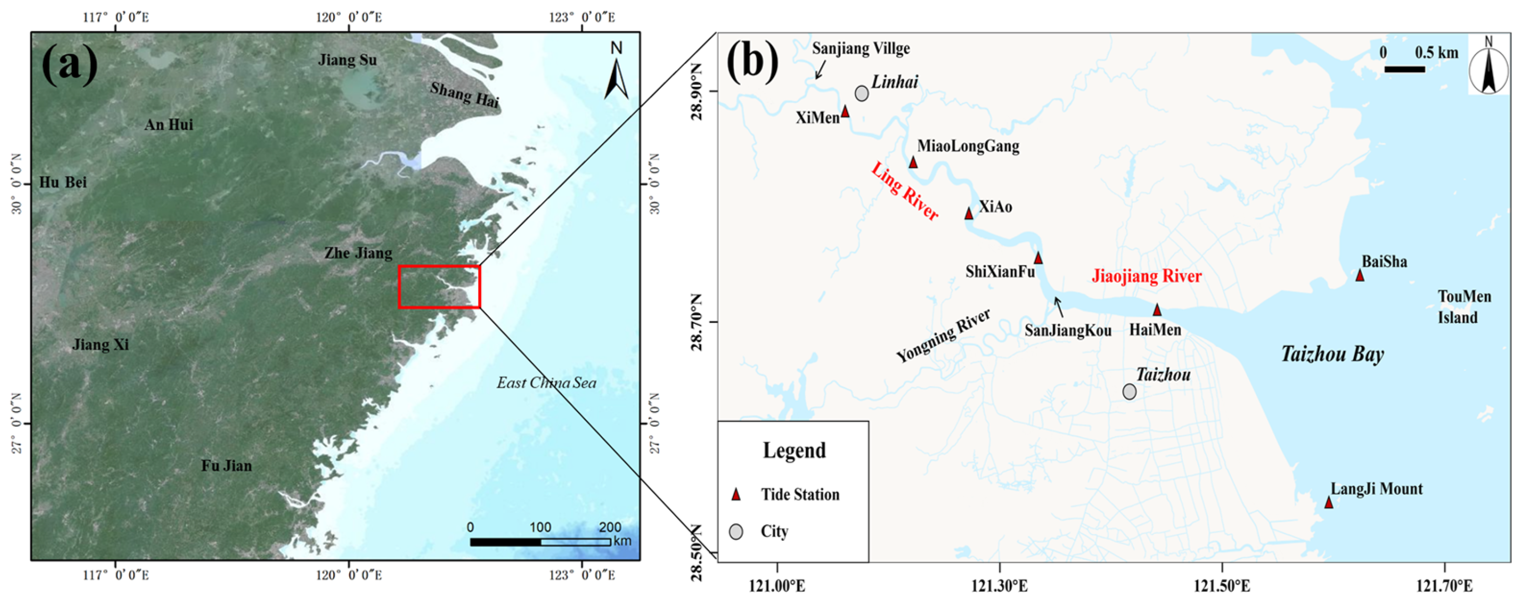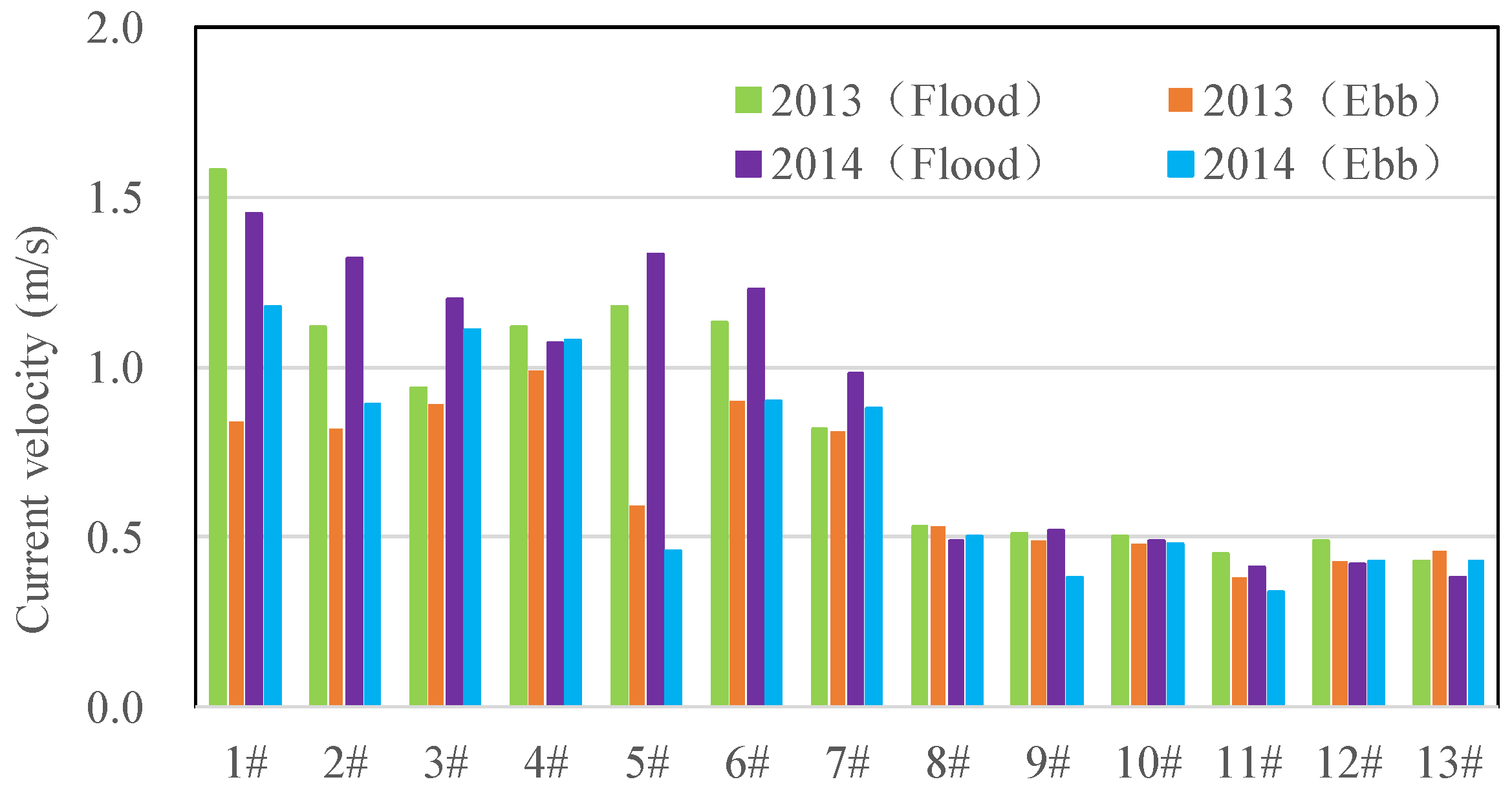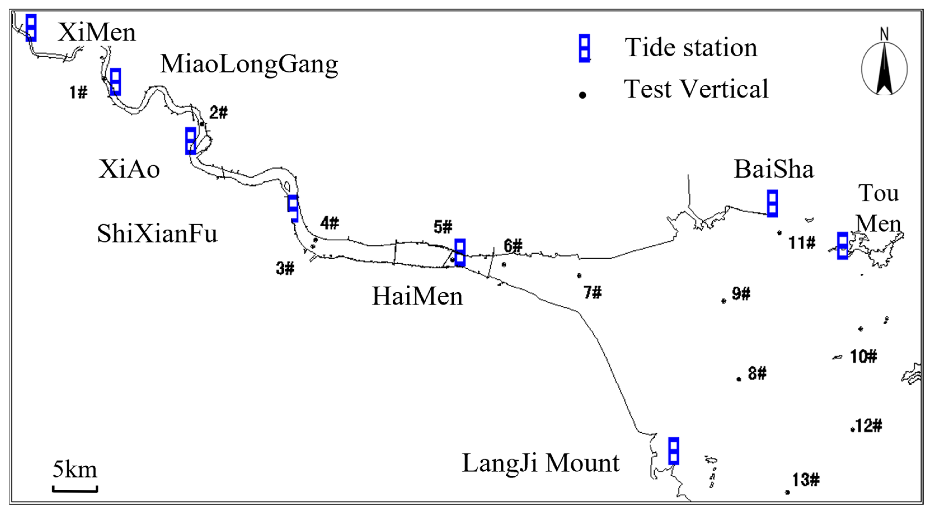 - Xia, W.Y.; Zhao, X.D.; Zhang, X.Z. Influence of variations in runoff and tide on spatial and temporal distribution of sediment concentration in the Jiaojiang River Estuary. Hydro-Sci. Eng. 2016, 3, 35–45. (In Chinese) [Google Scholar]