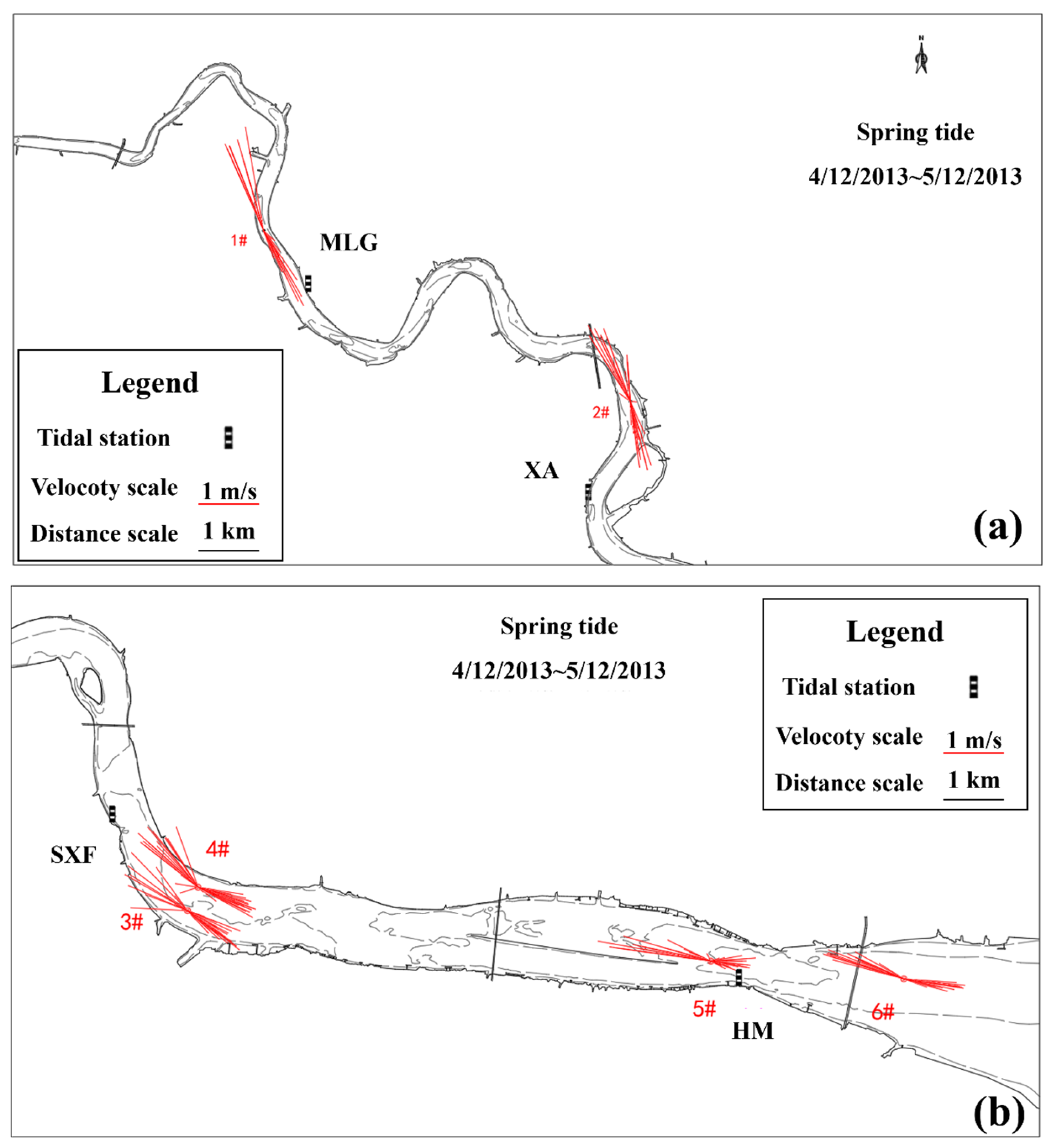 - Zhang, W.; Feng, H.; Hoitink, A.J.F.; Zhu, Y.; Gong, F.; Zheng, J. Tidal impacts on the subtidal flow division at the main bifurcation in the Yangtze River Delta. Estuar. Coast. Shelf Sci. 2017, 196, 301–314. [Google Scholar] [CrossRef]
