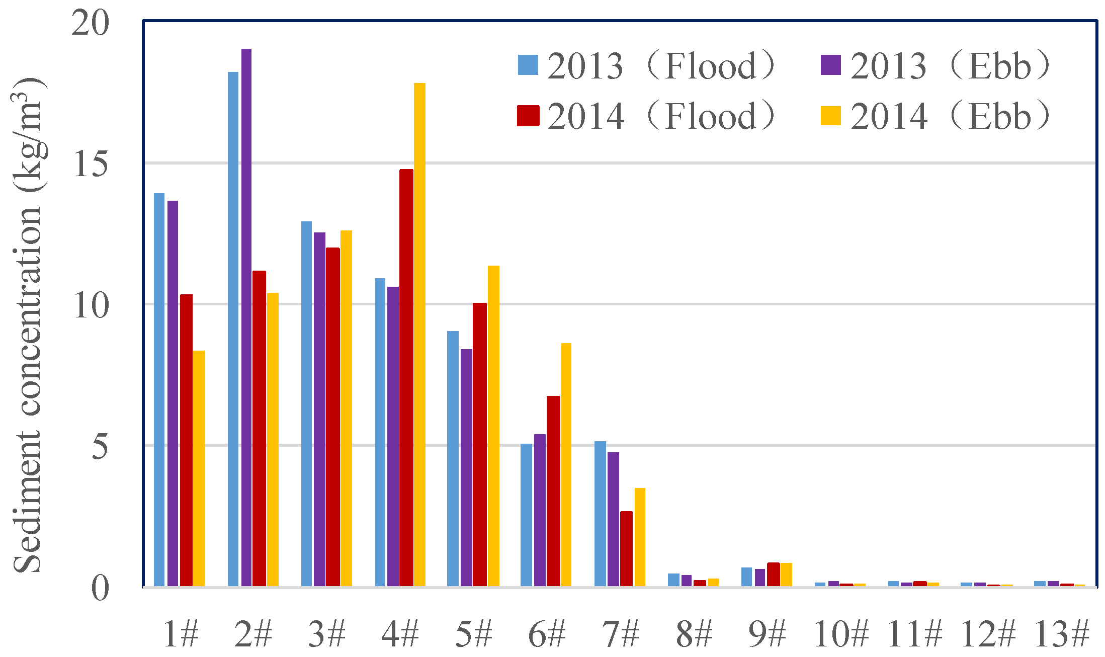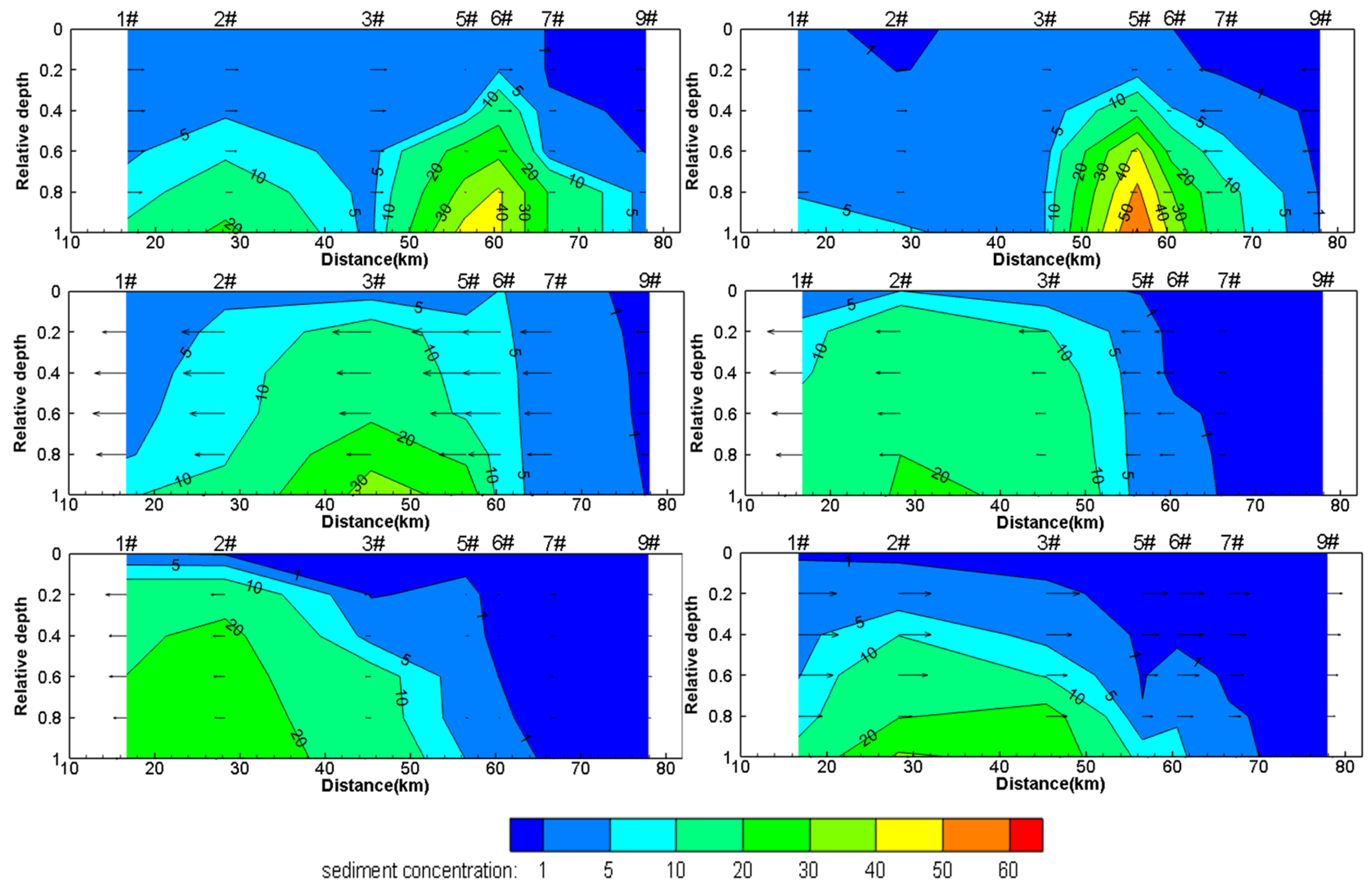 - Zhang, X.Z.; Chen, X.; Dou, X.P.; Zhao, X.D.; Xia, W.Y.; Jiao, J.; Xu, H. Study on formation mechanism of turbidity maximum zone and numerical simulations in macro-tidal estuaries. Adv. Water Sci. 2019, 30, 84–92. (In Chinese) [Google Scholar]