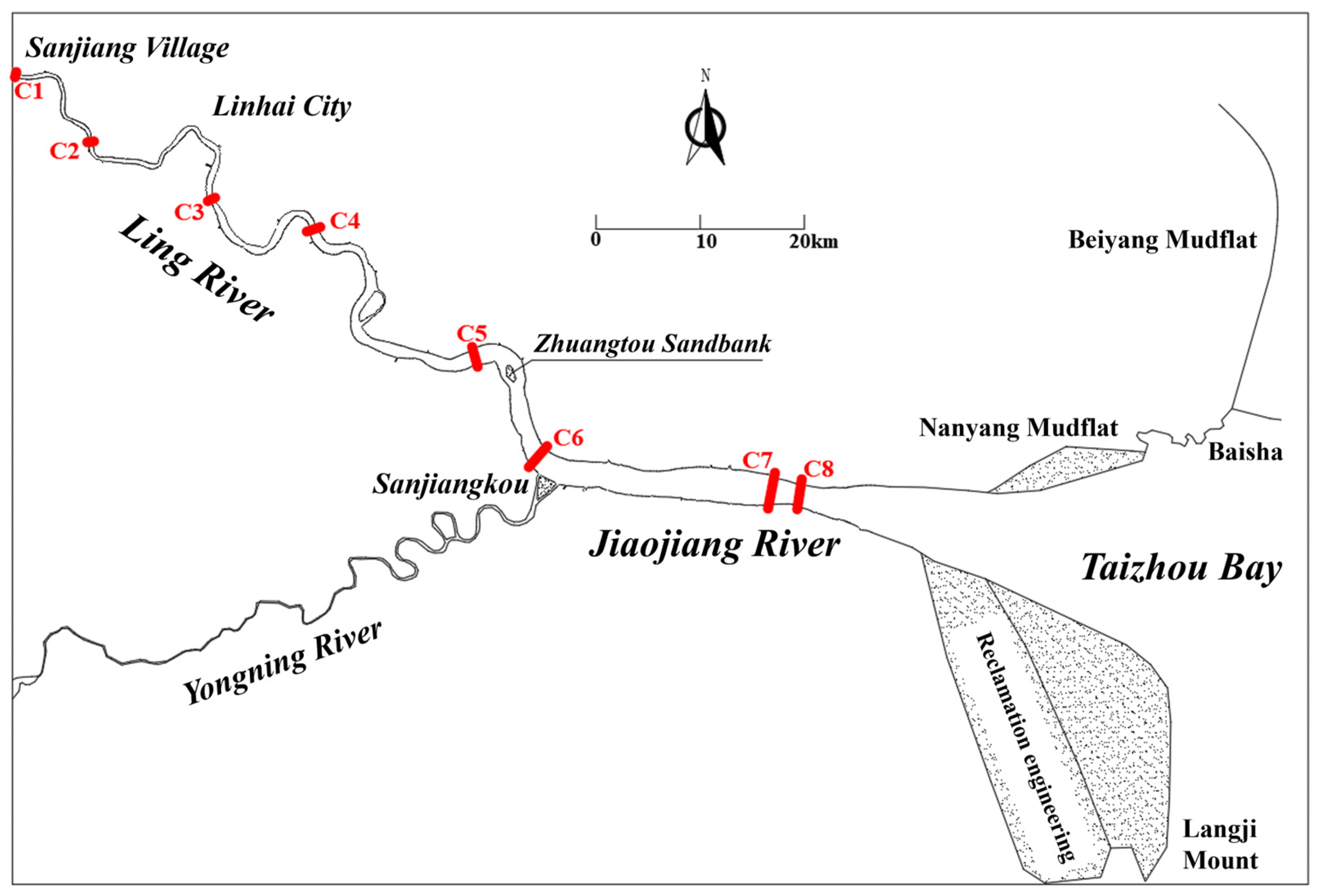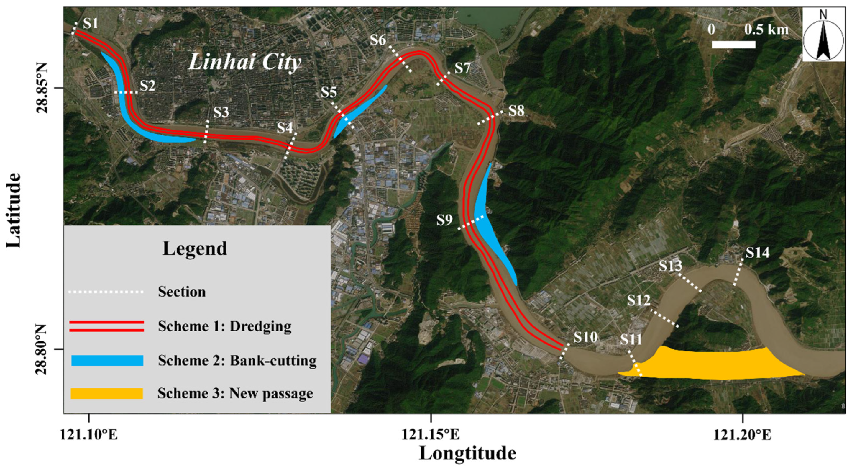 - Yao, Y.; Chen, X.; Yuan, J.; Li, L.; Guan, W. Impacts of channel dredging on hydrodynamics and sediment dynamics in the main channels of the Jiaojiang River Estuary in China. Acta Oceanol. Sin. 2023, 42, 132–144. [Google Scholar] [CrossRef]