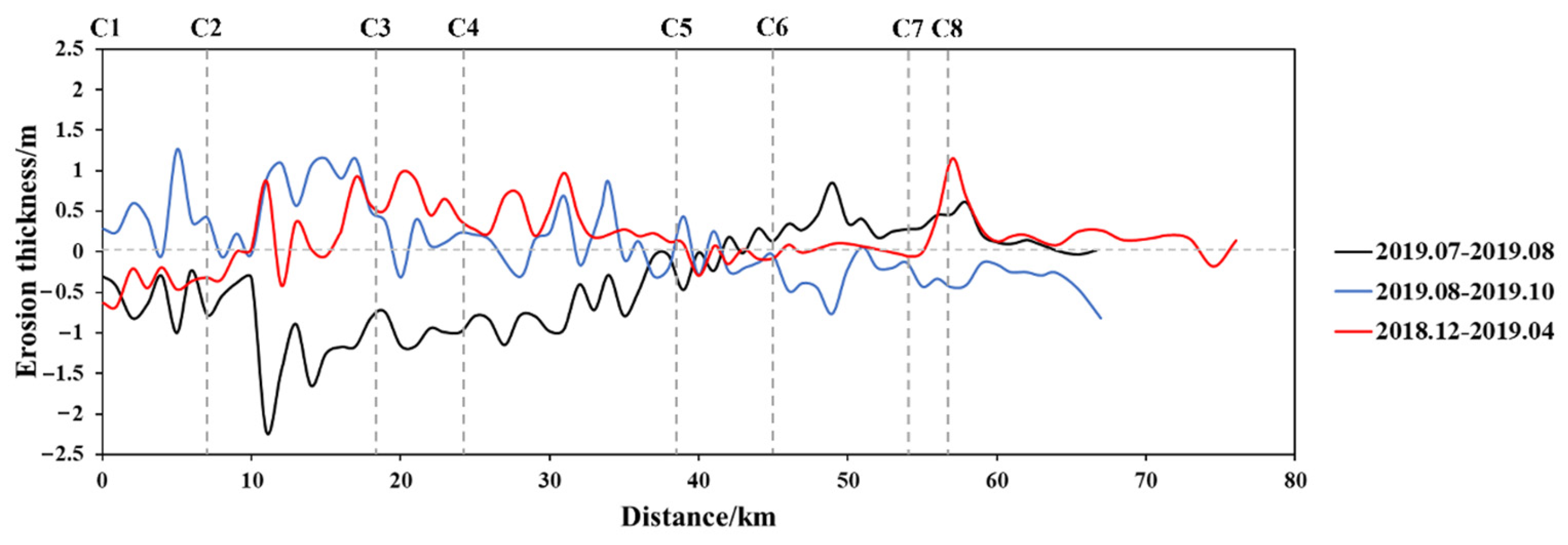 - Erosion and deposition in a MEMS are governed jointly by water and sediment conditions. Short flood pulses generate intense upstream erosion and downstream deposition. During the dry season, tidal currents erode the lower reach and transport sediment upstream, sustaining an approximate dynamic equilibrium throughout the year.