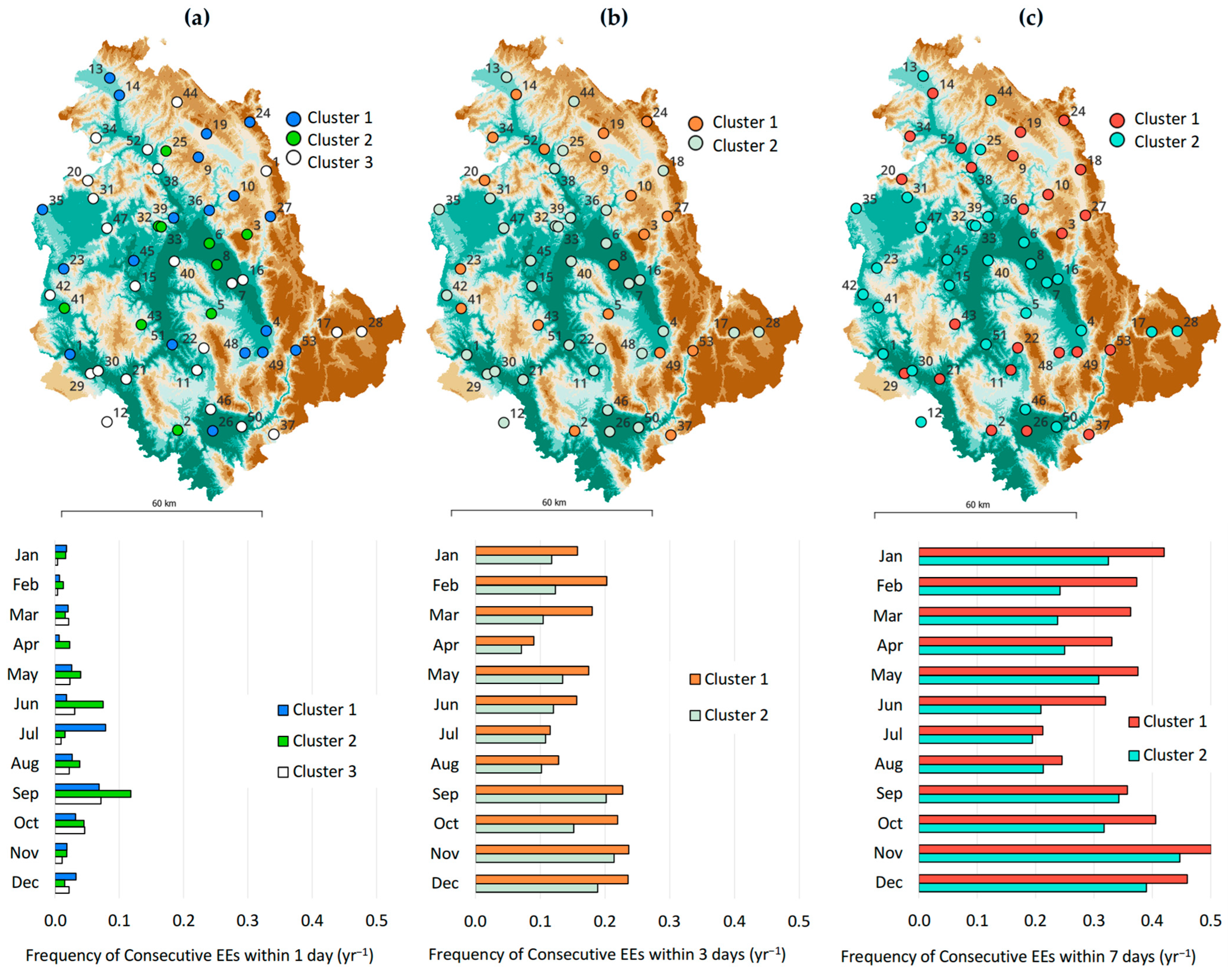 2.3. Spatiotemporal Characterization of Rainfall Events Above the Established Thresholds