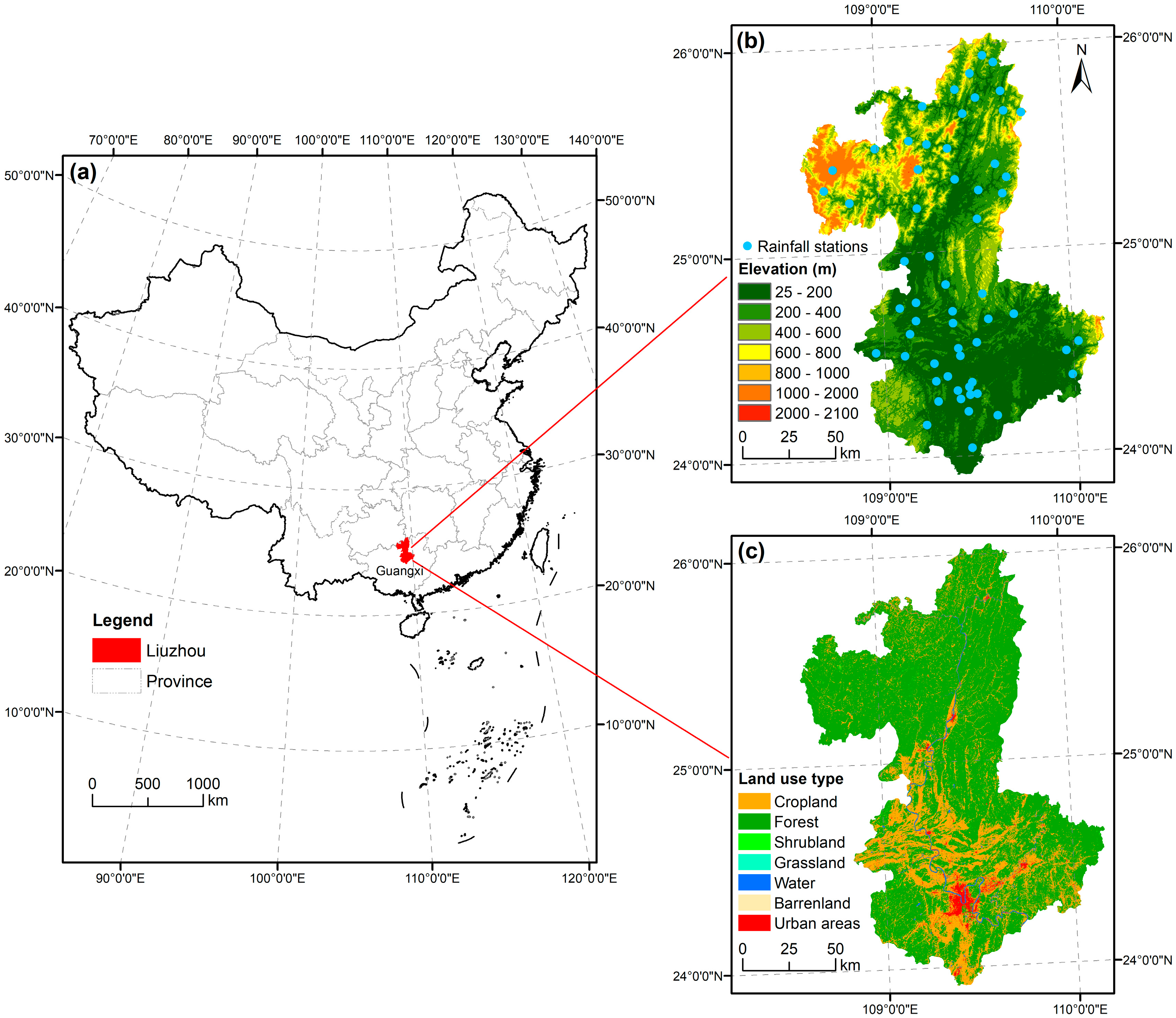 Lei C, Li Y, Pan C, Zhang J, Yin S, Wang Y, Chen K, Yang Q, Han L. Spatially Explicit Relationships Between Urbanization and Extreme Precipitation Across Distinct Topographic Gradients in Liuzhou, China. Water. 2026; 18(1):47. https://doi.org/10.3390/w18010047