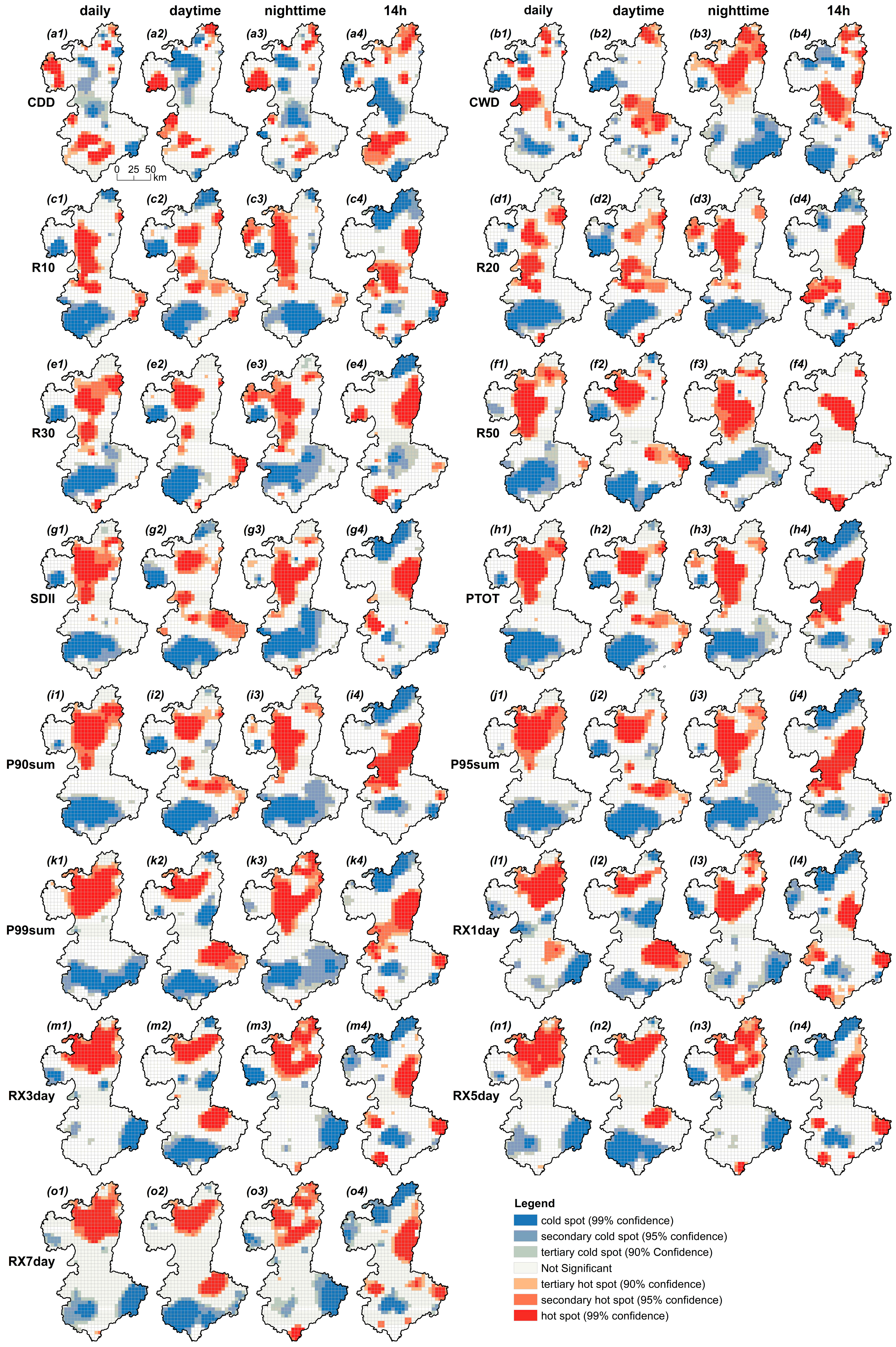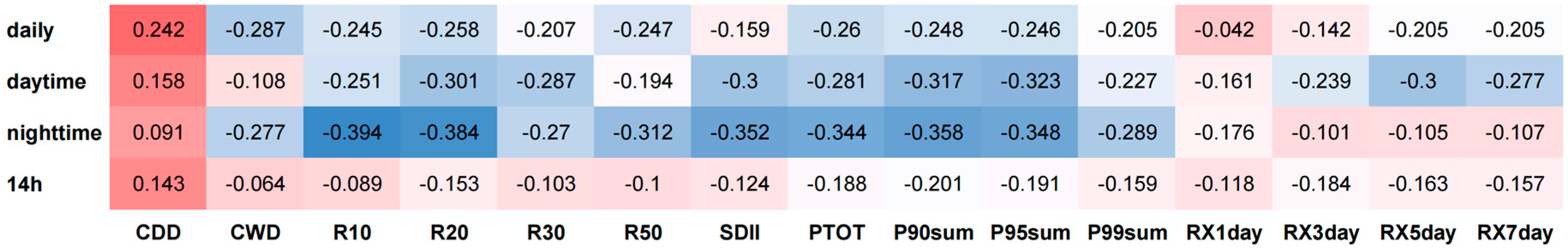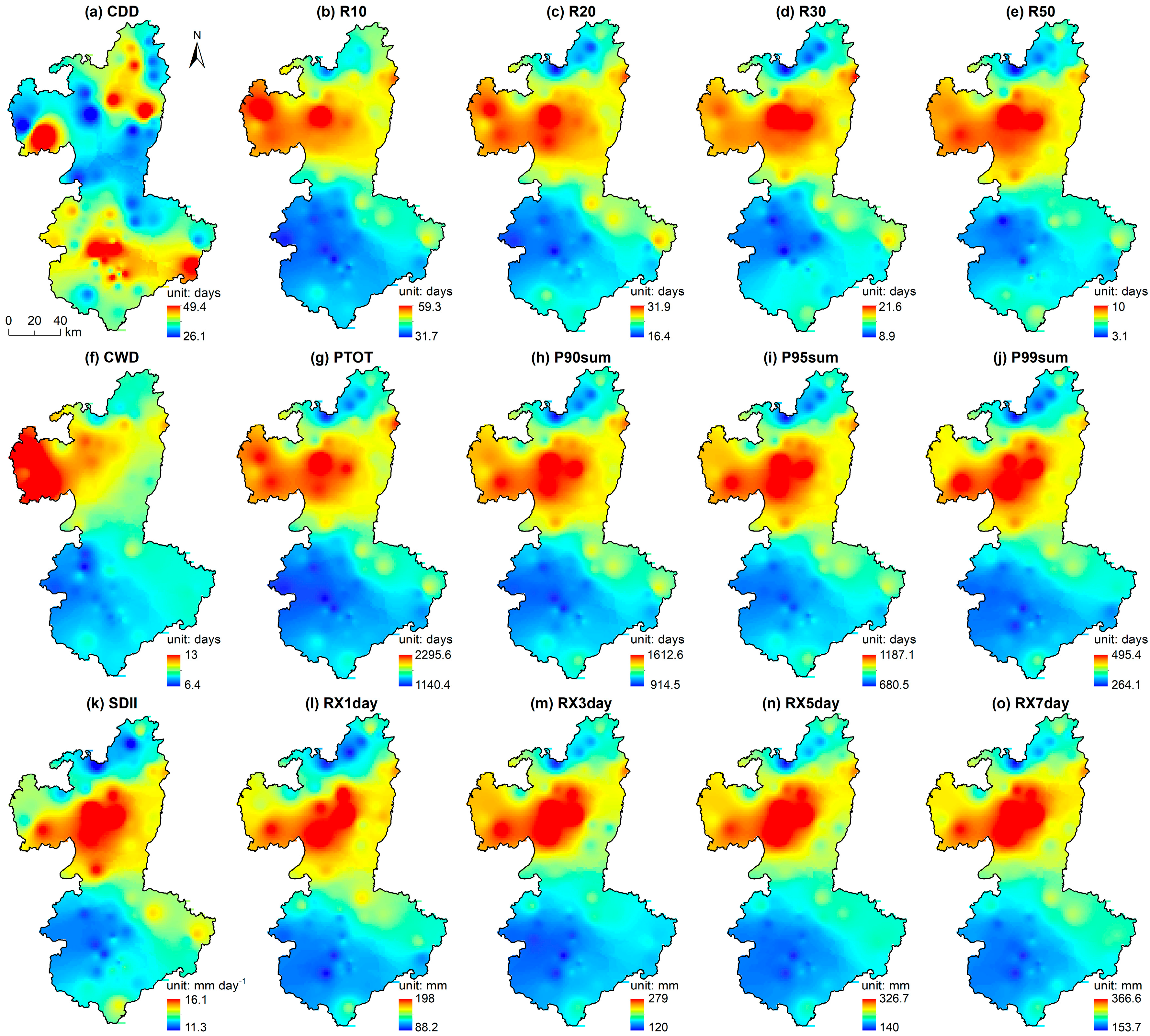 | Scales | CDD | CWD | R10 | R20 | R30 | R50 | SDII | PTOT | P90 Sum | P95 Sum | P99 Sum | RX1 Day | RX3 Day | RX5 Day | RX7 Day |