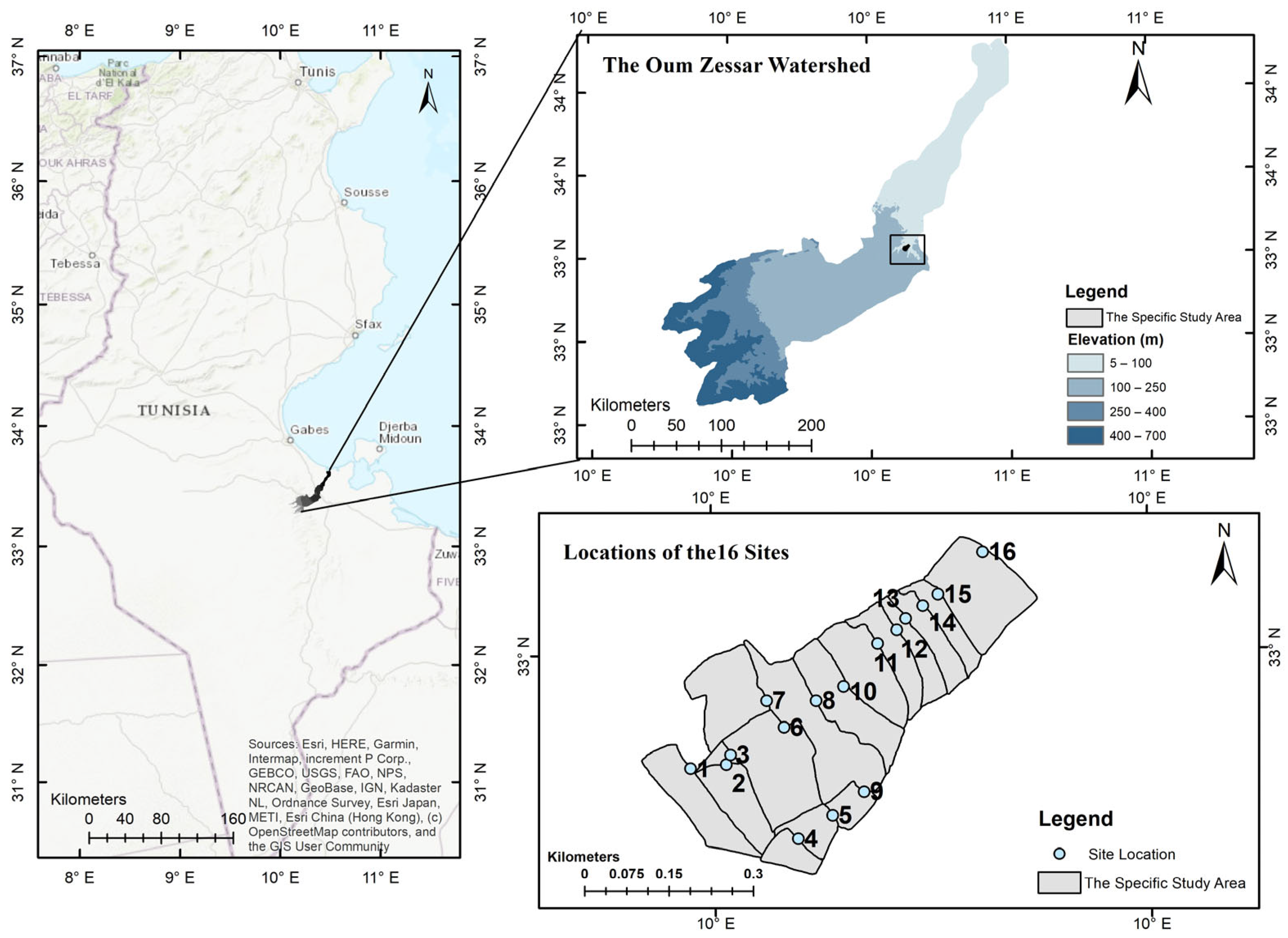 - Abdeladhim, M.A.; Fleskens, L.; Baartman, J.; Sghaier, M.; Ouessar, M.; Ritsema, C.J. Generation of potential sites for sustainable water harvesting techniques in Oum Zessar watershed, South East Tunisia. Sustainability 2022, 14, 5754. [Google Scholar] [CrossRef]