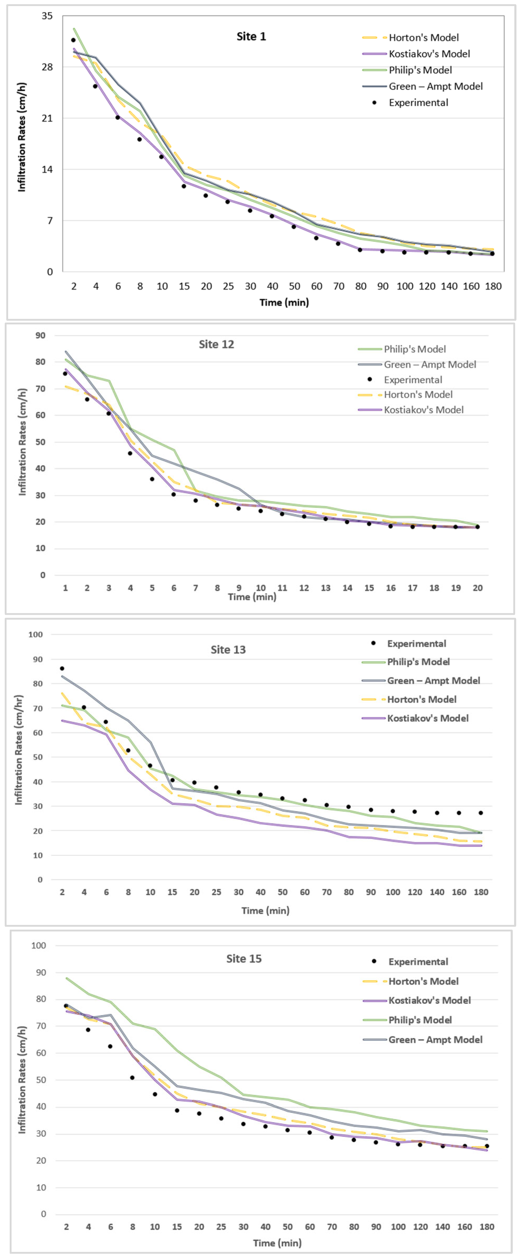 | Site # | Constant Infiltration Rate (cm/h) | Horton | Kostiakov | Philip | Green–Ampt | |||