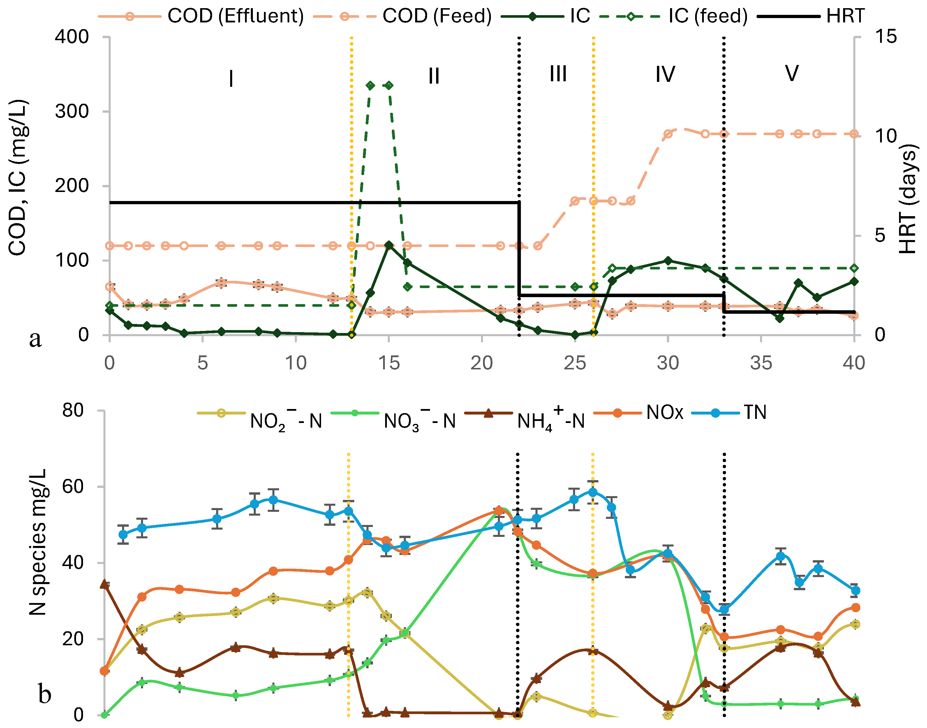 Figure 1). In most phases (e.g., I, III, and V), lower levels of IC corresponded to a lower NOx-to-TN ratio (or ammonia oxidation). These observations suggest that IC availability is a primary factor controlling nitrification, as it is essential for autotrophic nitrifying microorganisms [