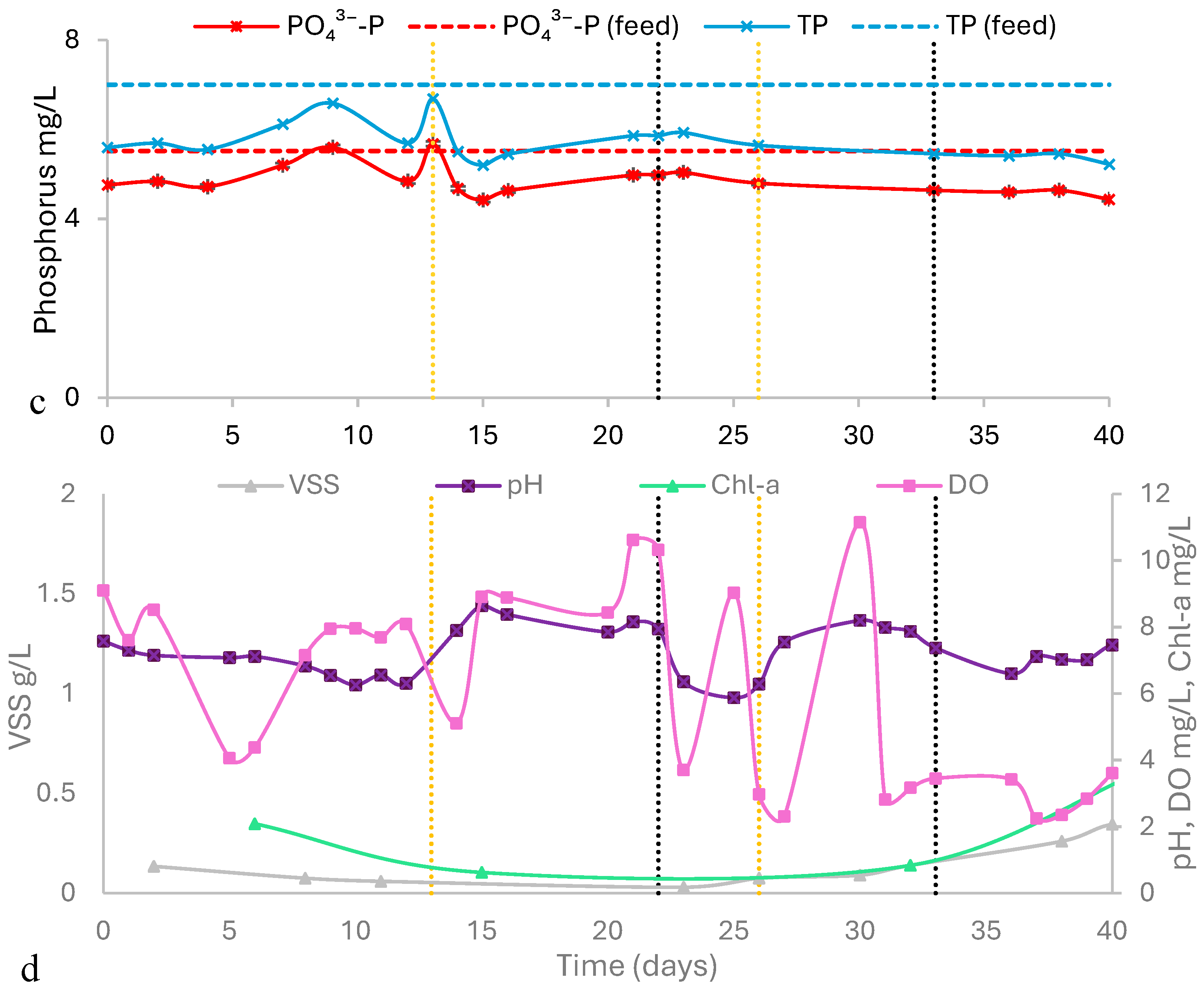 Overall, IC supplementation and reduced HRT collectively enhanced algal activity (increased Chl-a), shifted the system towards the algal dominance, and contributed to improved reactor performance (including nitrification) with a low biomass (MLVSS) of approximately 0.4 g/L (