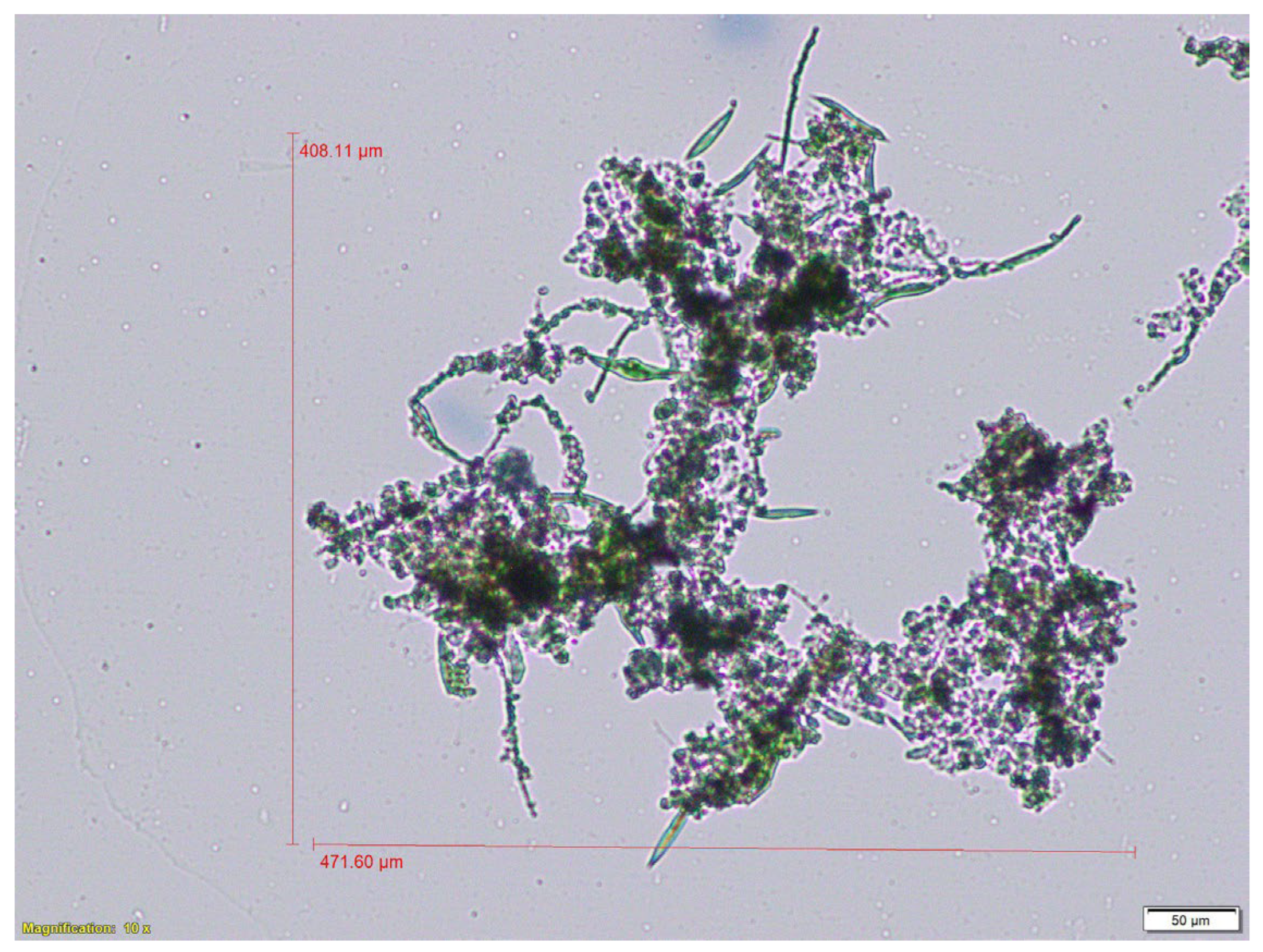Biomass particle sizes ranged from 50 to 470 µm, observed using an Olympus BX41 microscope (Olympus, Japan). Floc shapes varied from spherical to elongated, and different microalgae and bacterial species were identified (