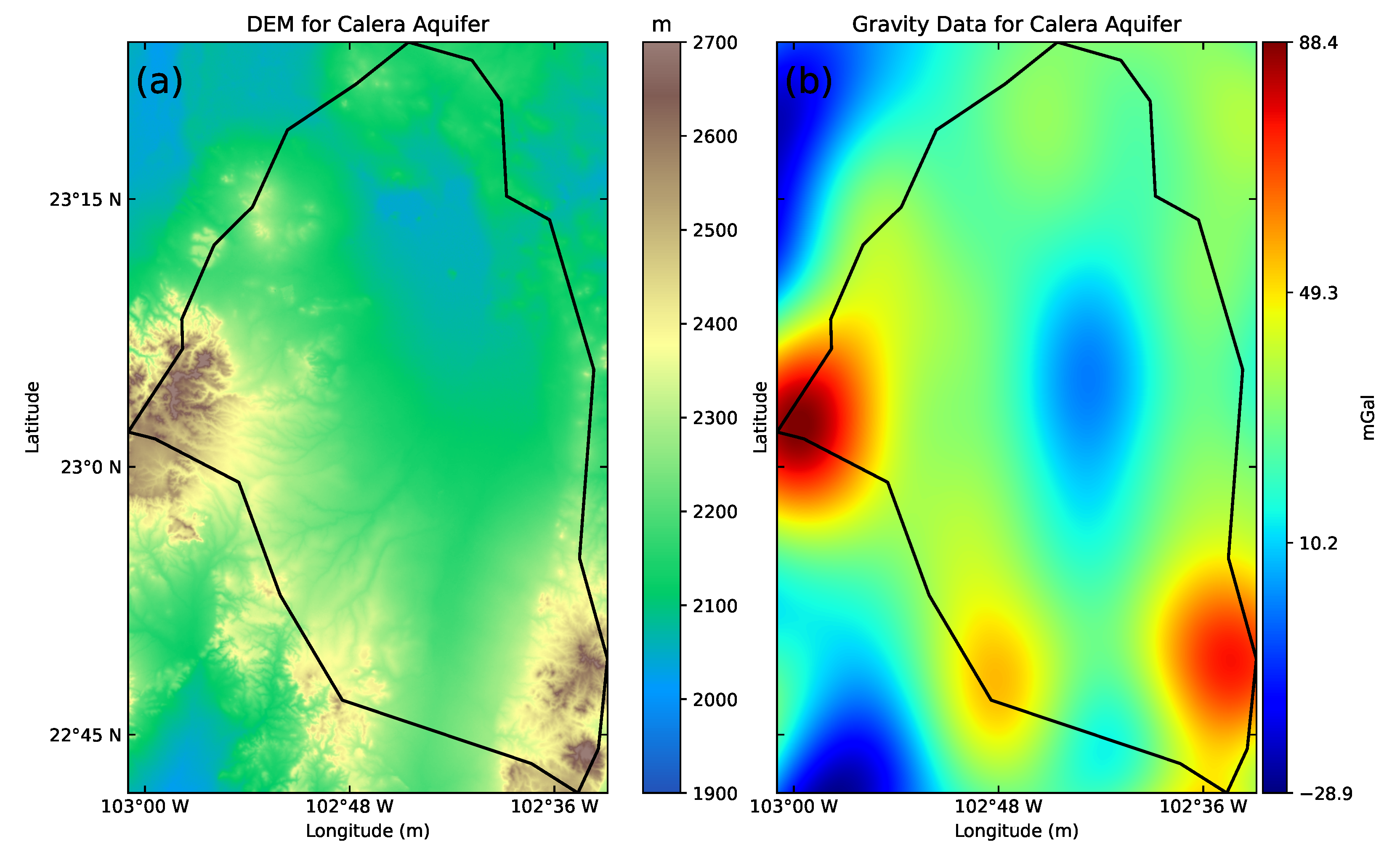 2.2. Digital Elevation Map and Gravity of Calera Aquifer