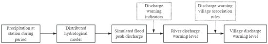 The discharge-based warning procedure operates as follows: during a rainfall event, if the simulated peak discharge at the river section nearest to a village exceeds the discharge warning threshold, an early warning is triggered. This study employs the distributed Xin’anjiang model for flood simulation [30,31,32]. To capture the spatial heterogeneity of rainfall across the watershed, the basin is divided into multiple sub-catchments. Runoff generation and concentration are computed for each sub-catchment, and the overall outflow hydrograph is derived by linearly aggregating the individual outflows. The workflow of the discharge-based warning process is presented in Figure 3.