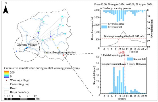 The rainfall and runoff characteristics of the Xiayang Village flash flood event are illustrated in Figure 5. In terms of rainfall conditions, heavier precipitation was concentrated in the southeastern part of the upstream catchment. The maximum 6 h accumulated rainfall reached 183.6 mm at the Shijiadibangfang-q Station (recorded from 06:00 to 12:00 on 20 August), exceeding the 6 h rainfall warning threshold (Figure 5B). Hydrologically, the simulated peak discharge at the stream associated with Xiayang Village reached 1717 m3/s, with a runoff coefficient of 0.79. The simulated discharge exceeded the warning threshold at 09:42 on 20 August, as shown in Figure 5A.