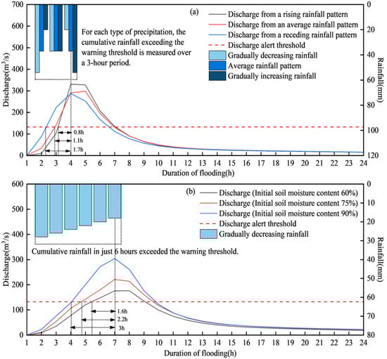 The model response scenario (Scenario 4) was designed with three parallel experiments by maintaining a fixed rainfall duration of 3 h while varying rainfall patterns. Comparative analysis with the warning results from the rainfall intensity comparison scheme reveals the impact of hydrological model response time on warning trigger timing. Under conditions where the 1 h and 3 h cumulative rainfall do not significantly exceed the warning thresholds and antecedent soil moisture is low, when the rainfall duration is 1 h, the rainfall-based warning is triggered earlier than the discharge-based warning, as shown in Figure 10a. When the rainfall duration extends to 3 h, the discharge-based warning is triggered earlier than the rainfall-based warning, and this sequence remains unaffected by variations in rainfall patterns, as demonstrated in Figure 10b. Therefore, if the model response time is insufficient, rainfall-based warnings will be triggered earlier than discharge-based warnings, and this regularity is not affected by rainfall patterns.