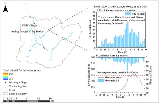 The flash flood event in Chili Village from 24 to 26 July 2024 was successfully forecasted by the discharge-based warning (triggered at 11:50), while the rainfall-based warning failed to issue an alert. This missed rainfall-based warning was primarily attributed to the persistent moderate- to low-intensity rainfall pattern. In this event, the maximum 1 h, 3 h, and 6 h cumulative rainfall values did not exceed their respective warning thresholds. While the discharge-based method was able to account for the cumulative effect of continuous rainfall and consequently triggered the warning in time.