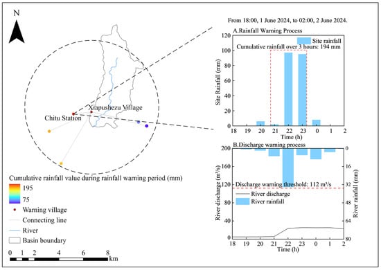 The monitored rainfall-based warning (issued at 23:00 on 1 June 2024) for Xiapushezu Village during the 1–2 June flash flood event resulted in a false alarm, while the discharge-based warning correctly withheld an alert. The false alarm in the rainfall-based warning is primarily due to the spatial heterogeneity of precipitation. Intense short-duration rainfall occurred outside the upstream catchment of the village, where the 3 h accumulated rainfall exceeded the warning threshold. However, as shown in Figure 8B, rainfall along the rivers within the associated catchment was relatively weak, and the heavy precipitation outside the catchment had no decisive influence on the rising stage of discharge in the village’s associated river reach. Therefore, in hilly watersheds, under conditions of spatially heterogeneous rainfall, especially when intense rainfall occurs outside the village catchment, the discharge-based warning provides higher accuracy than the rainfall-based method.