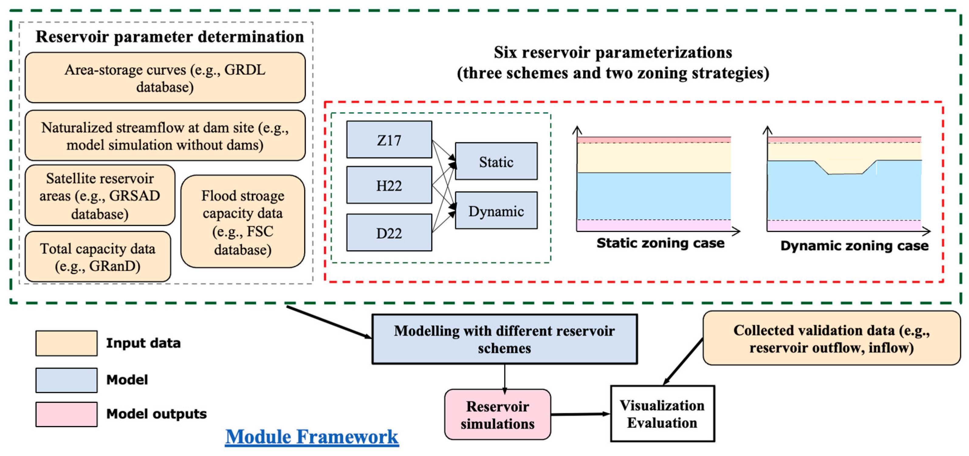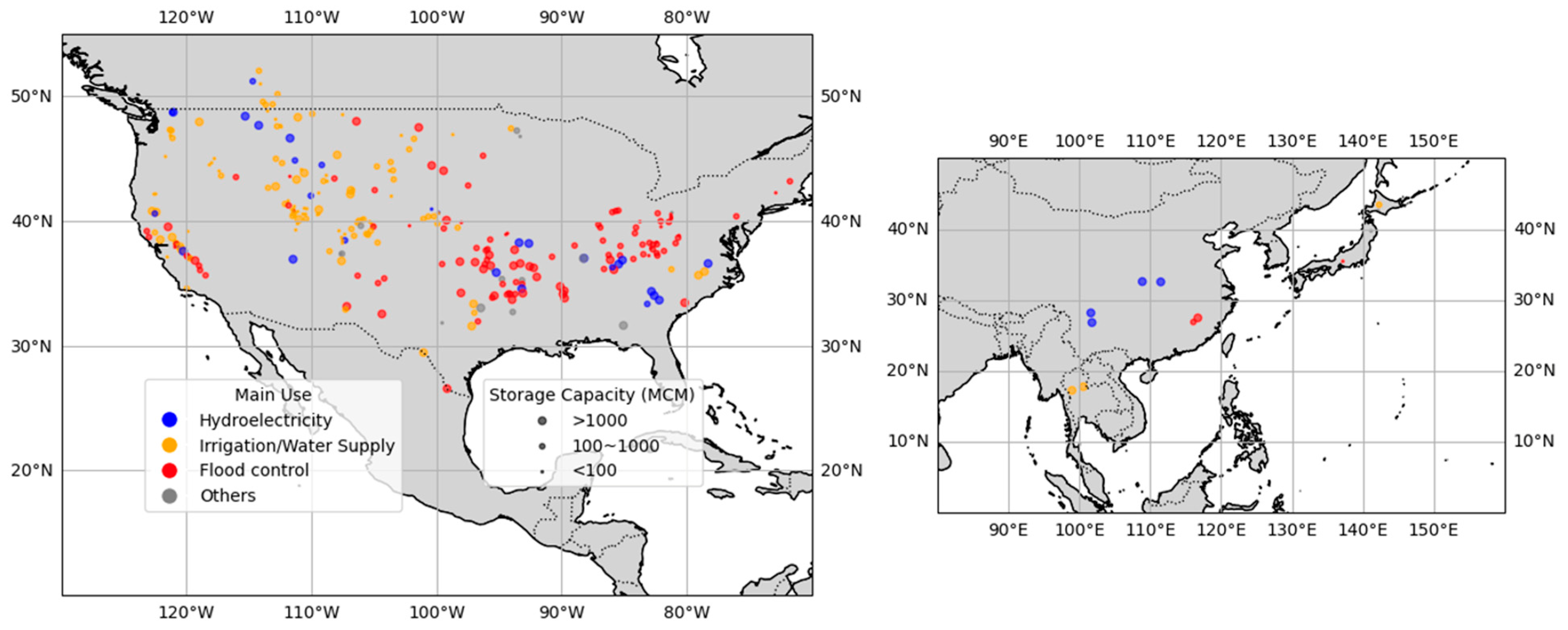 - Shen, Y.; Yamazaki, D.; Pokhrel, Y.; Zhao, G. Improving global reservoir parameterizations by incorporating flood storage capacity data and satellite observations. Water Resour. Res. 2024, 61, e2024WR037620. [Google Scholar] [CrossRef]