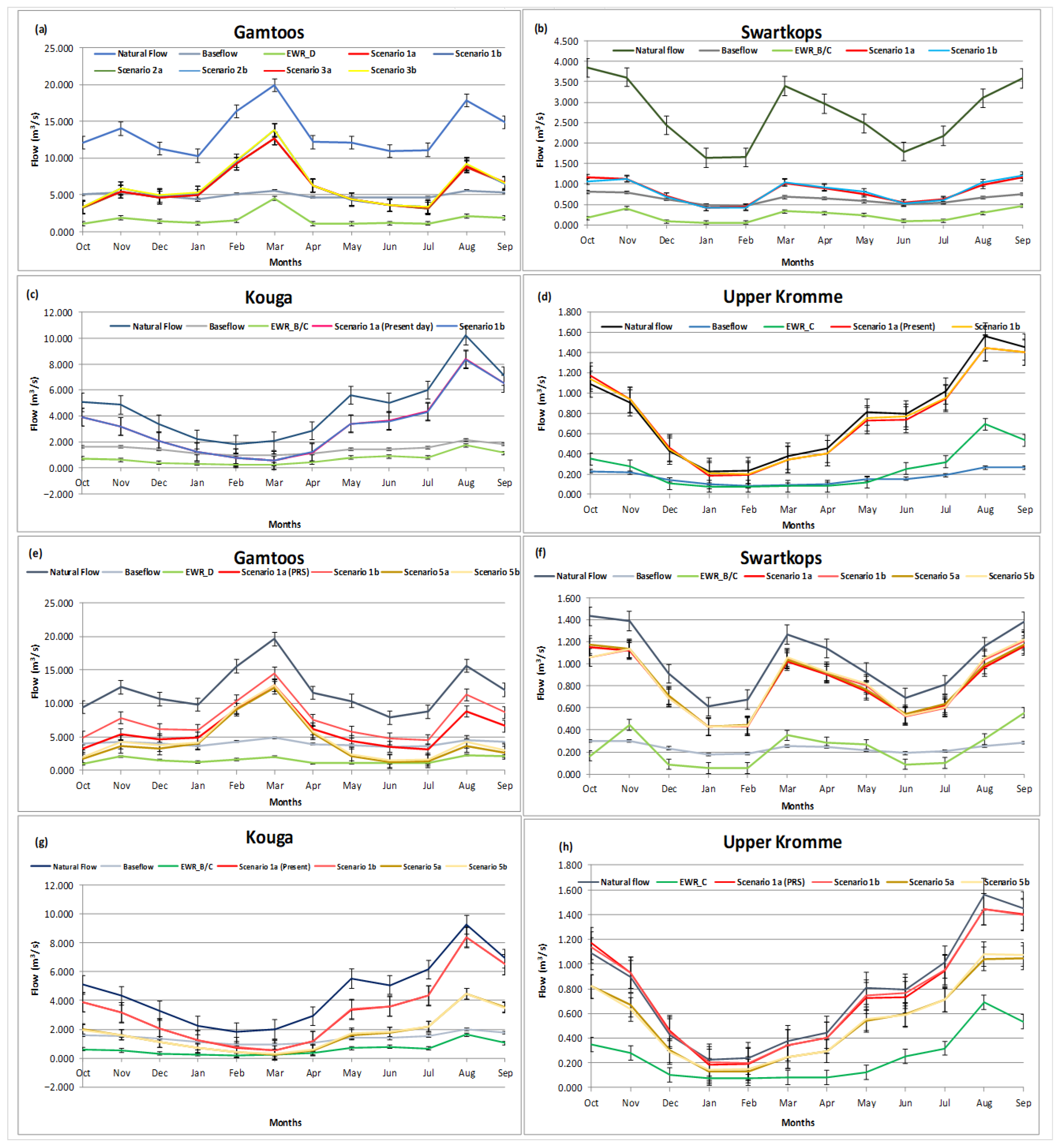 - Five water resource scenarios were designed and evaluated to capture a likely water resource condition for the present and future. The analysis showed that impact is expected under any of the operational scenarios assessed at the selected reaches. However, the climate change scenarios (Sc5a and Sc5b) showed significant variability in the Upper Kromme, Swartkop, Kouga, and Gamtoos systems.