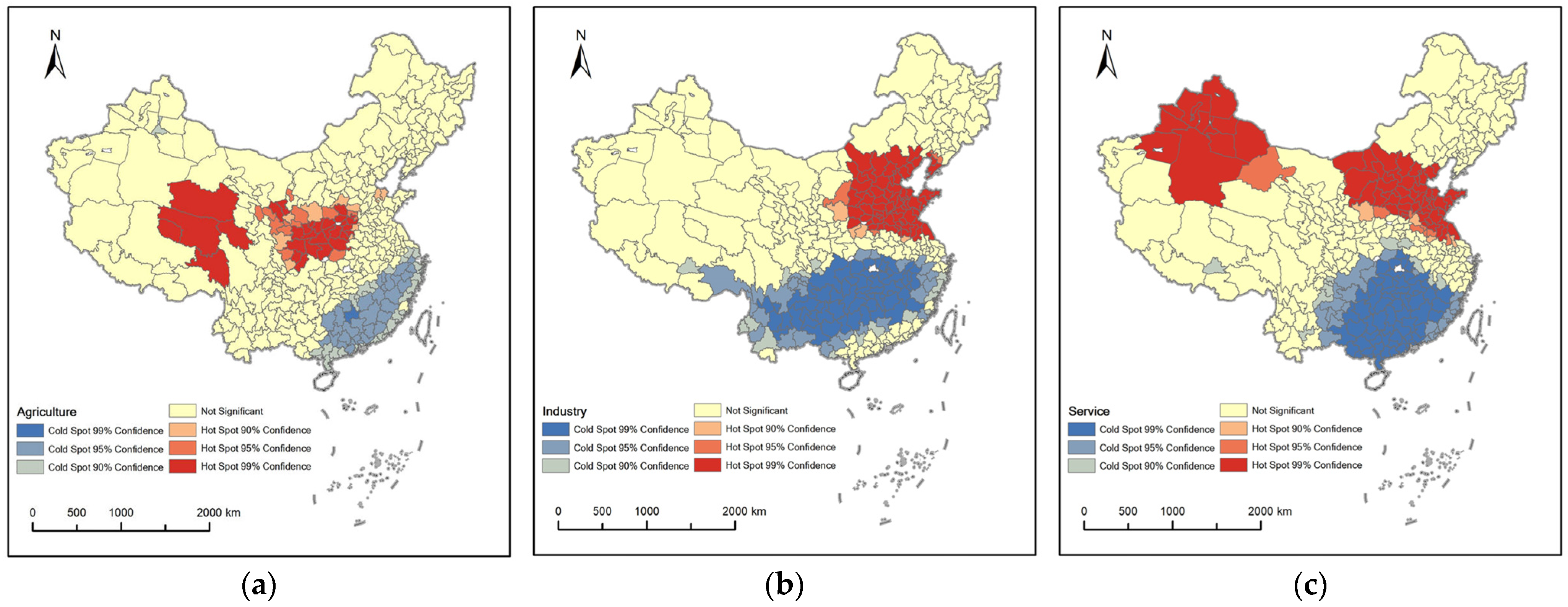 - Global Moran’s I shows statistically significant positive autocorrelation for all three sectors, while the Getis-Ord General G statistic indicates pronounced high-value clustering in industry. Hotspots for agricultural economic benefits of water use are concentrated in central regions such as Henan, Anhui, and Sichuan, as well as the northeastern Qinghai–Tibet Plateau, whereas industry and service benefits are concentrated in the North China Plain, with an extra service hotspot in central-eastern Xinjiang. Cold spots are systematically located south of the Yangtze River—especially the hilly southeast (Zhejiang, Fujian, Hunan, Guangdong)—whereas most southern coastal cities escape the low-benefit zone for all sectors. Spatial hotspot analysis can reveal the partial distribution characteristics of the economic benefit of water use to a certain extent, such as the primary regions exhibiting high or low benefits. ESDA provides significant evidence for the analysis of spatial heterogeneity with regard to the economic benefits of water use in China.