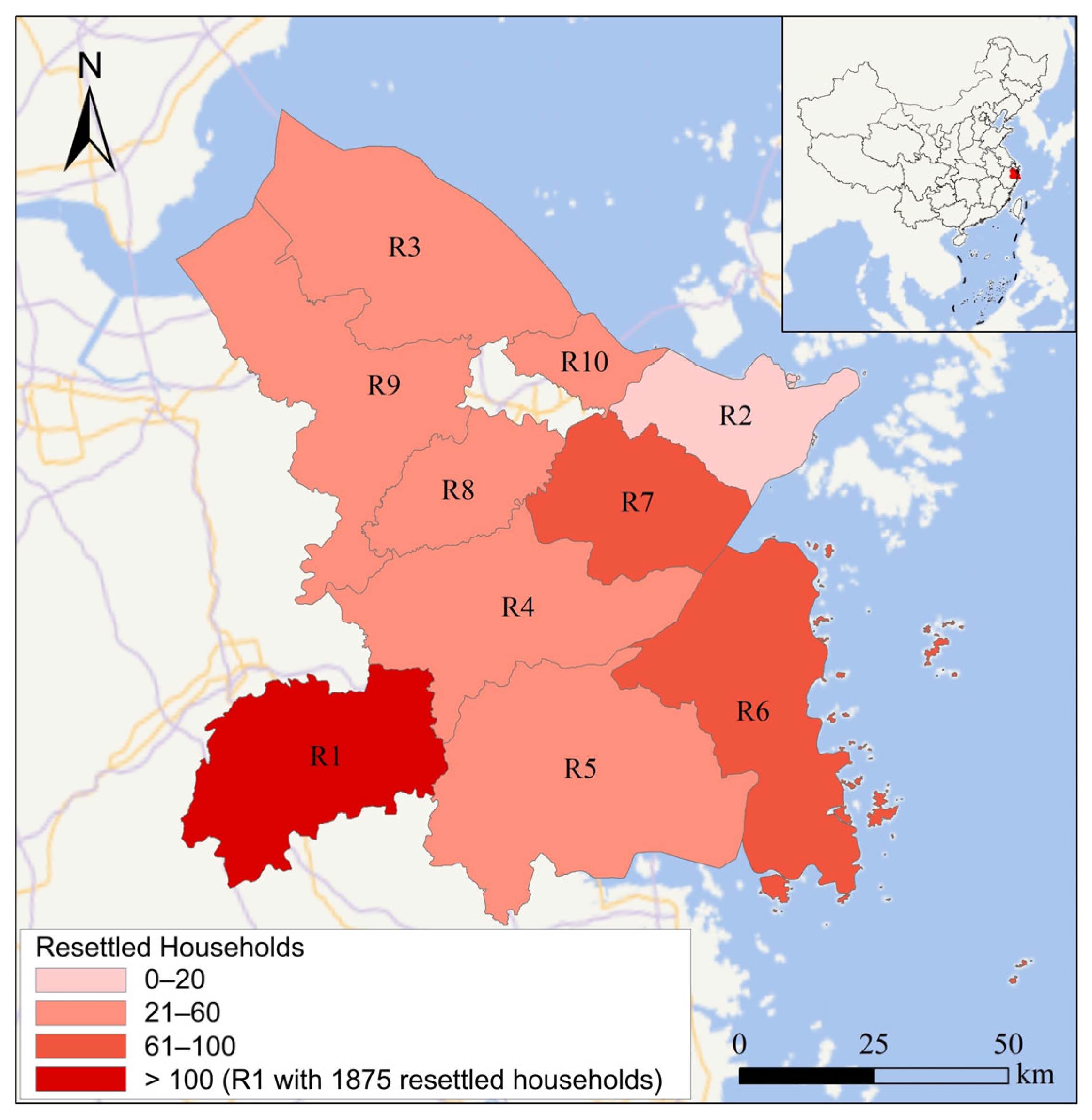 R5 marginally clusters with R4 and R8 in a “high–high” configuration, enabled by commercial complementarities and frequent regional interaction. However, resettler–industry mismatch weakens overall livelihood linkages.