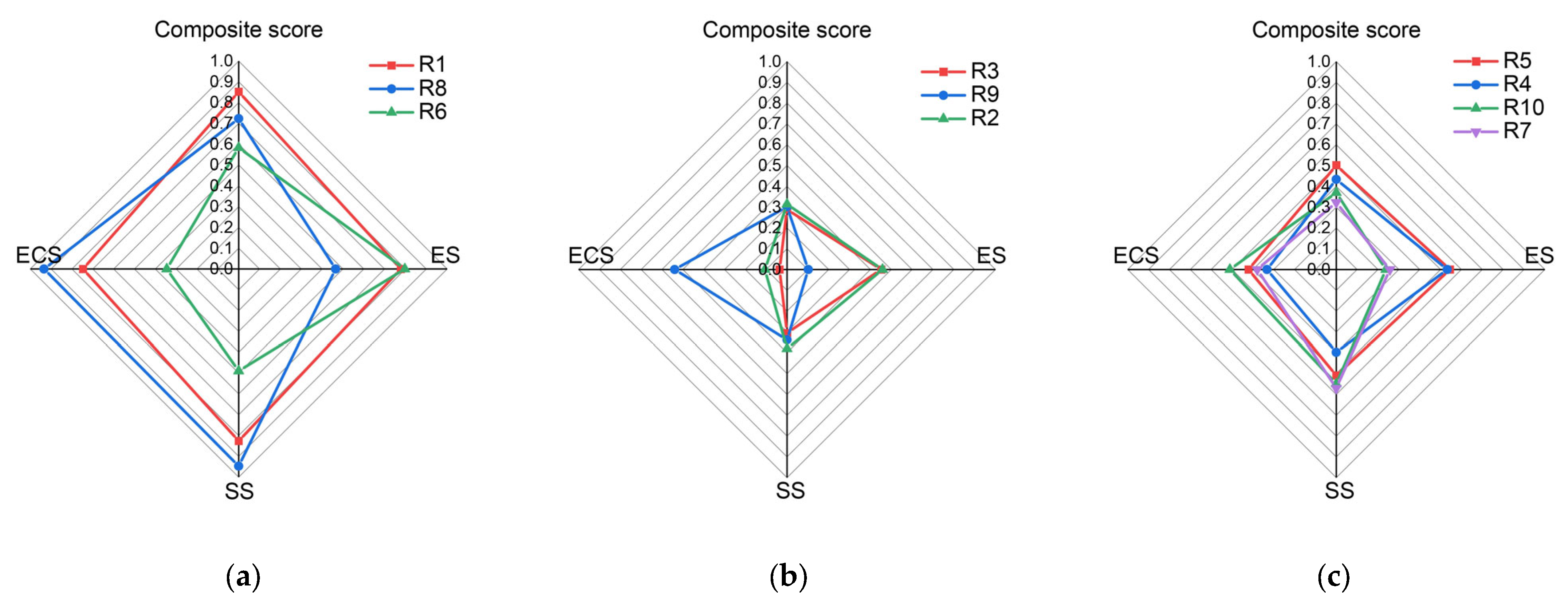 Figure 3c. R5 has a well-developed commercial and service sector but limited employment alignment for resettlers, reflected in a low ES4 score. R10 performs relatively well in ECS, but its small industrial base constrains job creation, leading to a weak ES dimension.