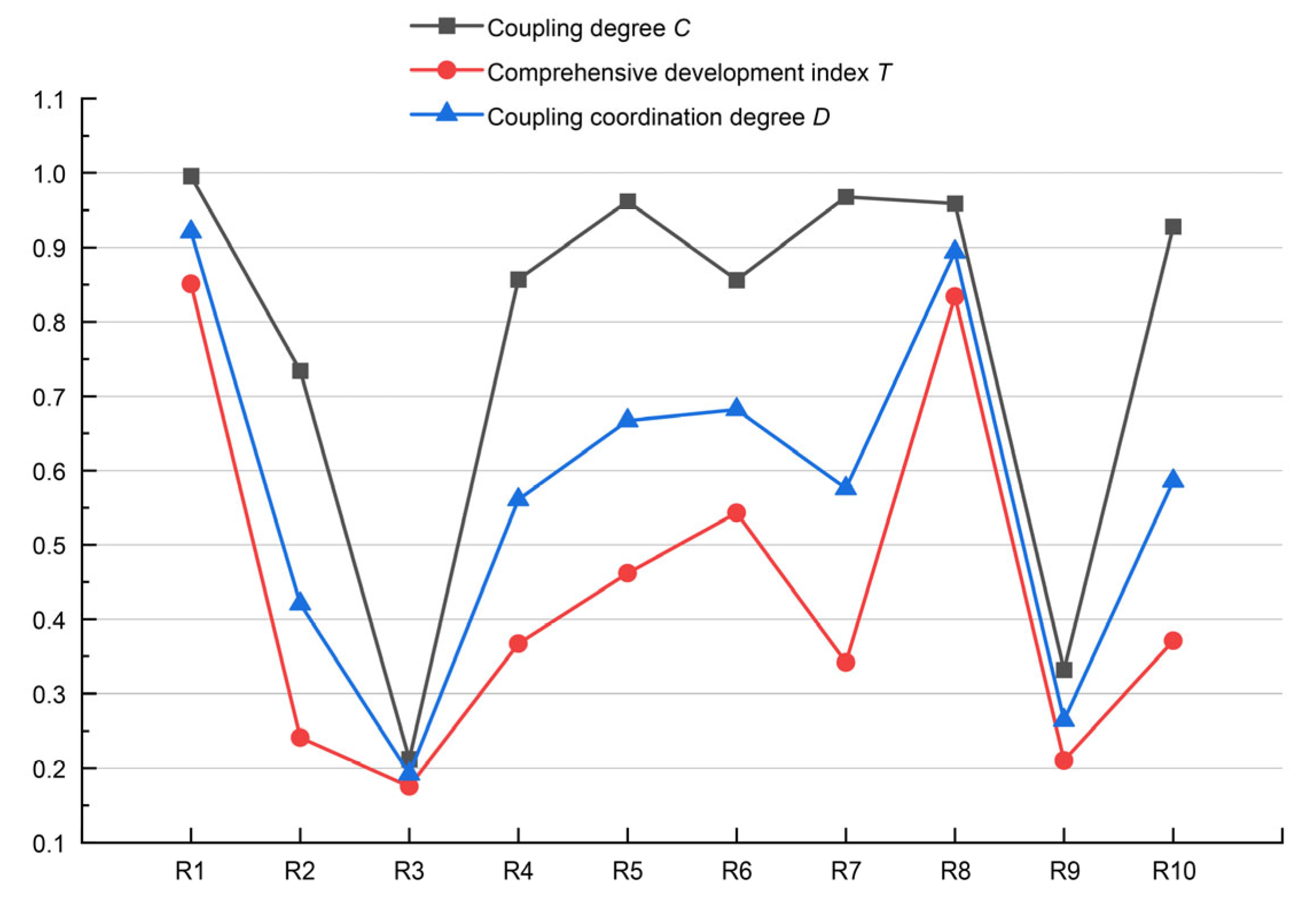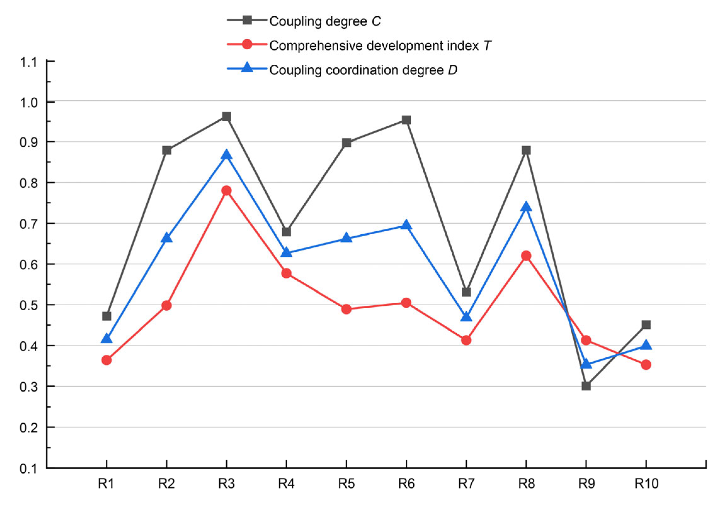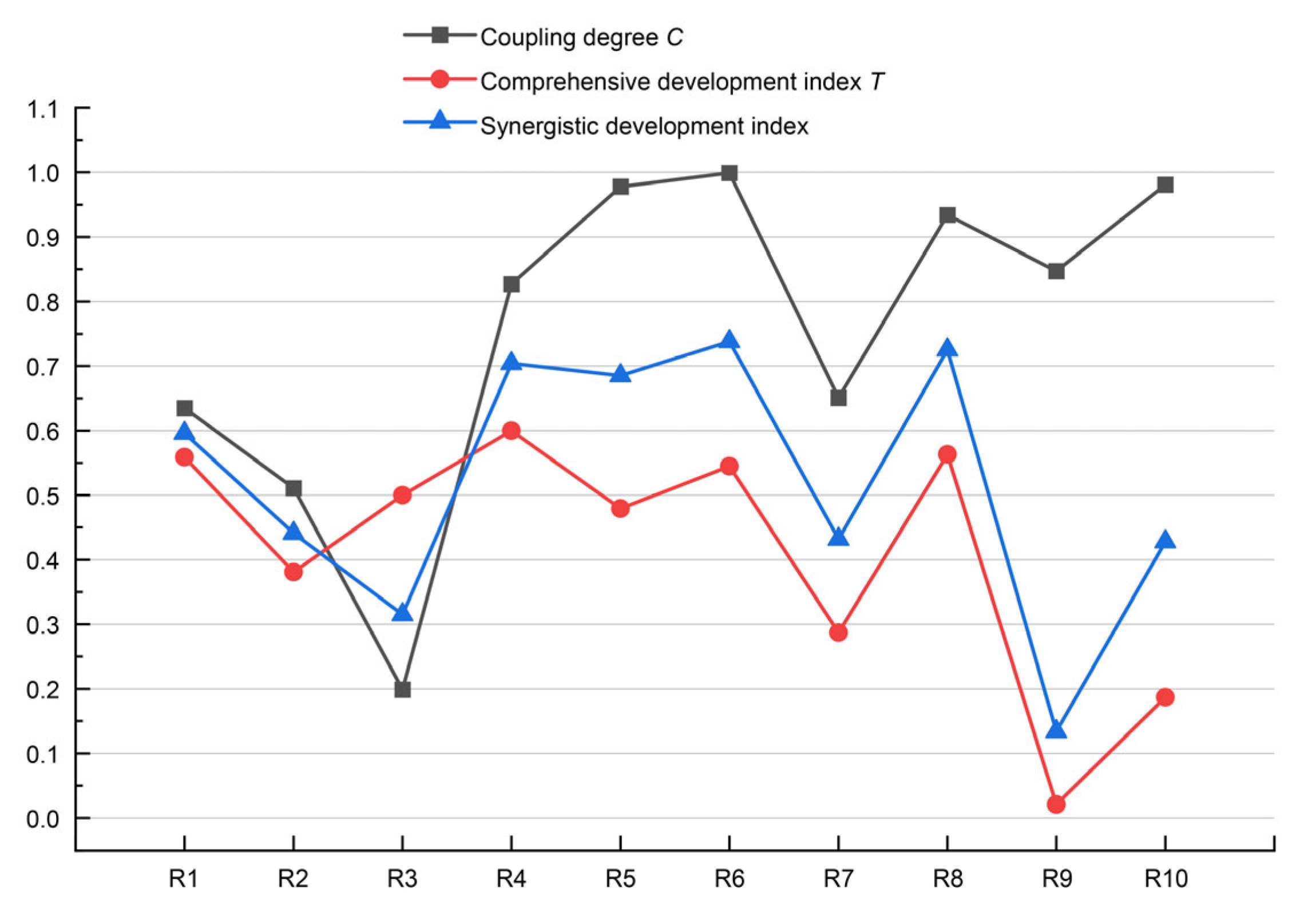 (2) Medium coordination areas include R6 (0.682), R5 (0.667), R10 (0.586), R7 (0.576), and R4 (0.561). These regions display partial coordination, wherein one dimension performs strongly while others show relative deficiencies.