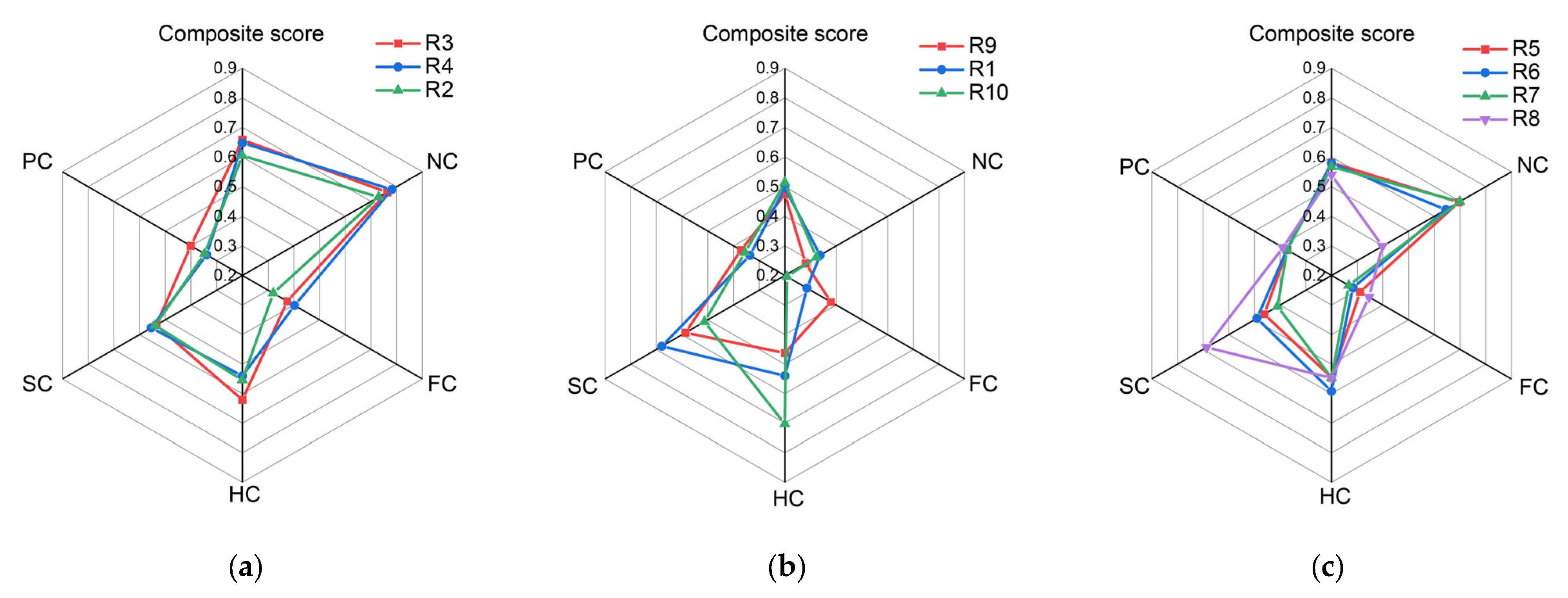 Analysis by capital dimension confirms consistency with observed regional realities. In FC, urban centers (e.g., R4) attain higher scores, whereas agricultural regions (e.g., R7) face greater income risks due to industrial concentration. In HC, industrialized areas (e.g., R3) display superior skill alignment, while rural zones (e.g., R9) experience lower employment rates. In NC, water-source protection regions (e.g., R1) are notably constrained by environmental regulations. For PC and SC, urban localities (e.g., R4) benefit from improved housing conditions and greater social participation, whereas peripheral regions (e.g., R10) face limitations in basic support infrastructure.