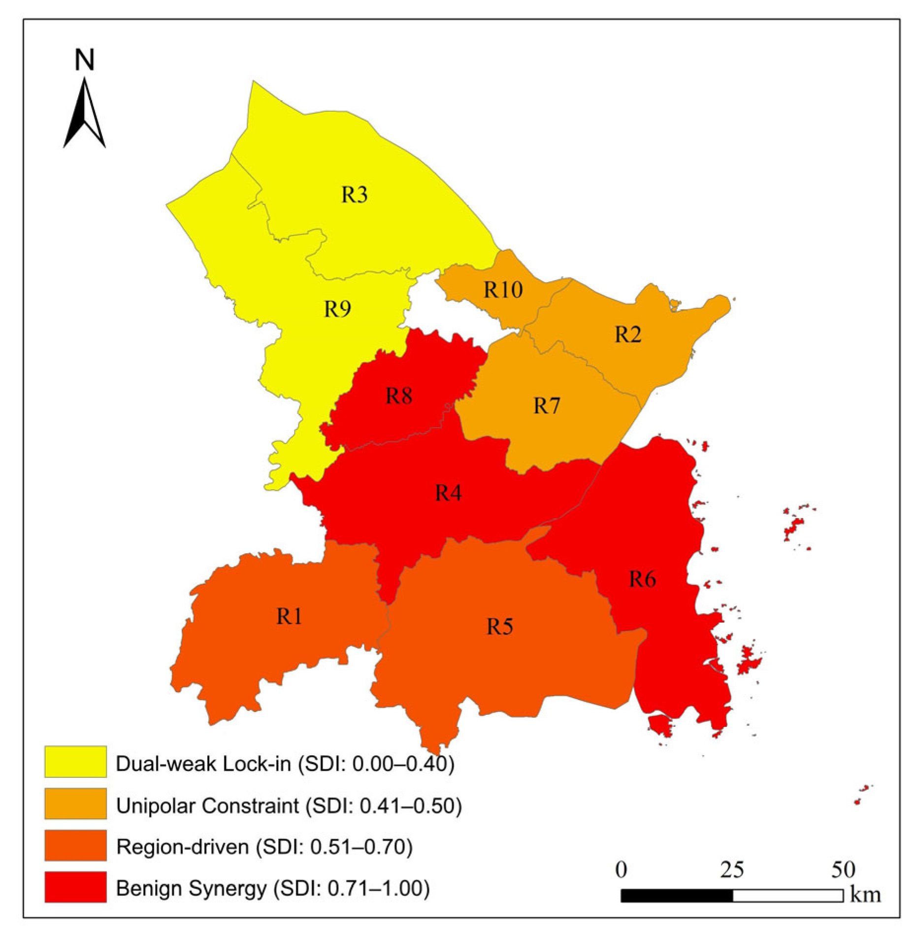 (3) Unipolar Constraint type includes R2 (SDI = 0.441), R7 (SDI = 0.432), and R10 (SDI = 0.428). In these regions, substantial deficiencies in one subsystem suppress overall coordination, necessitating targeted interventions to alleviate single-dimension bottlenecks.