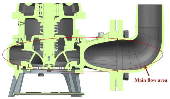 Based on the structure of the sewage pump, the main flow passage regions were identified, and the full-flow computational fluid domain was extracted and modeled as shown in Figure 3. The computational fluid domain primarily includes inlet and outlet sections, fixed knife, front cavity, impeller, pump cavity, volute, and rear cavity.