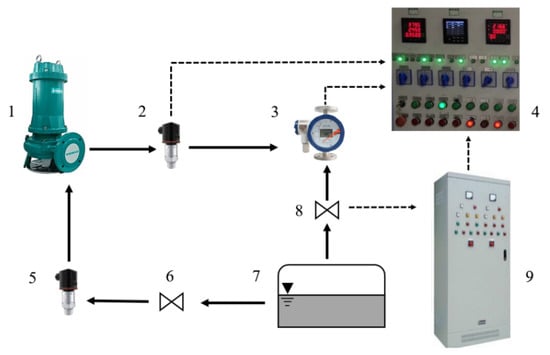 Figure 7. Layout diagram of sewage pump performance testing system. 1, Water pump; 2, Pressure sensor; 3, Electromagnetic flowmeter; 4, Data processing center; 5, Pressure sensor; 6, Control valve; 7, Water tank; 8, Control valve; 9, Control center.