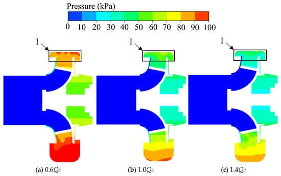 To analyze the influence of solid particles on internal flow in a semi-open impeller sewage pump, simulations were performed at 0.6Qd, 1.0Qd, and 1.4Qd with a particle diameter of 1 mm, particle density of 2300 kg/m3, and a solid phase volume fraction of 10%. Figure 11 illustrates the pressure distribution in the radial mid-section. The fluid enters through the fixed cutter, passes through the impeller, and is discharged into the volute, with pressure gradually increasing from the inlet to the outlet, peaking in the volute. This pressure rise is primarily due to the work performed by the rotating impeller, which converts mechanical energy into hydraulic pressure energy through centrifugal force. Additionally, the pressure in the rear cavity exceeds that in the front cavity, which is a result of the asymmetric structure of the semi-open impeller.