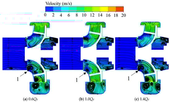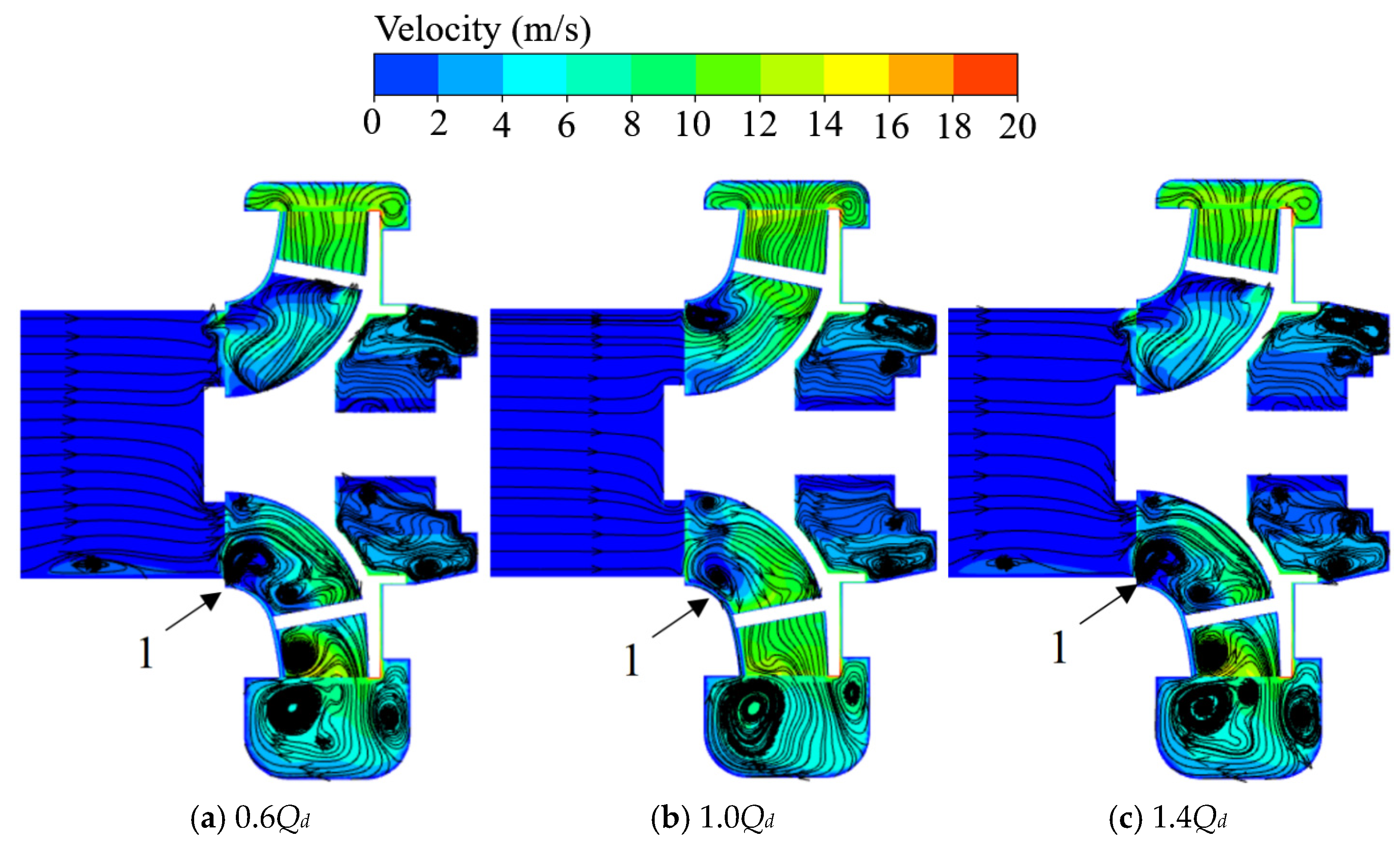 Figure 12 shows the velocity distribution in the radial mid-section of the sewage pump under flow conditions of 0.6Qd, 1.0Qd, and 1.4Qd. As shown in the figure, the fluid enters the impeller through the fixed cutter from the pump inlet and then flows into the volute channel. Inside the impeller, the fluid gradually accelerates from the impeller inlet and reaches its maximum velocity at the impeller outlet. This increase in velocity is primarily driven by the transfer of kinetic energy from the rotating impeller blades to the fluid. A notable feature observed in the figure is the occurrence of backflow phenomena of varying degrees in both the impeller and rear cavity regions. This backflow is primarily due to the geometry of the fixed cutter at the front section of the impeller inlet, which disrupts the fluid flow near the impeller inlet. The altered flow path induces flow separation, creating low-pressure zones that lead to backflow at the impeller inlet. The intensity of the backflow varies with the flow rate, being more pronounced at lower flow rates (Zone 1).