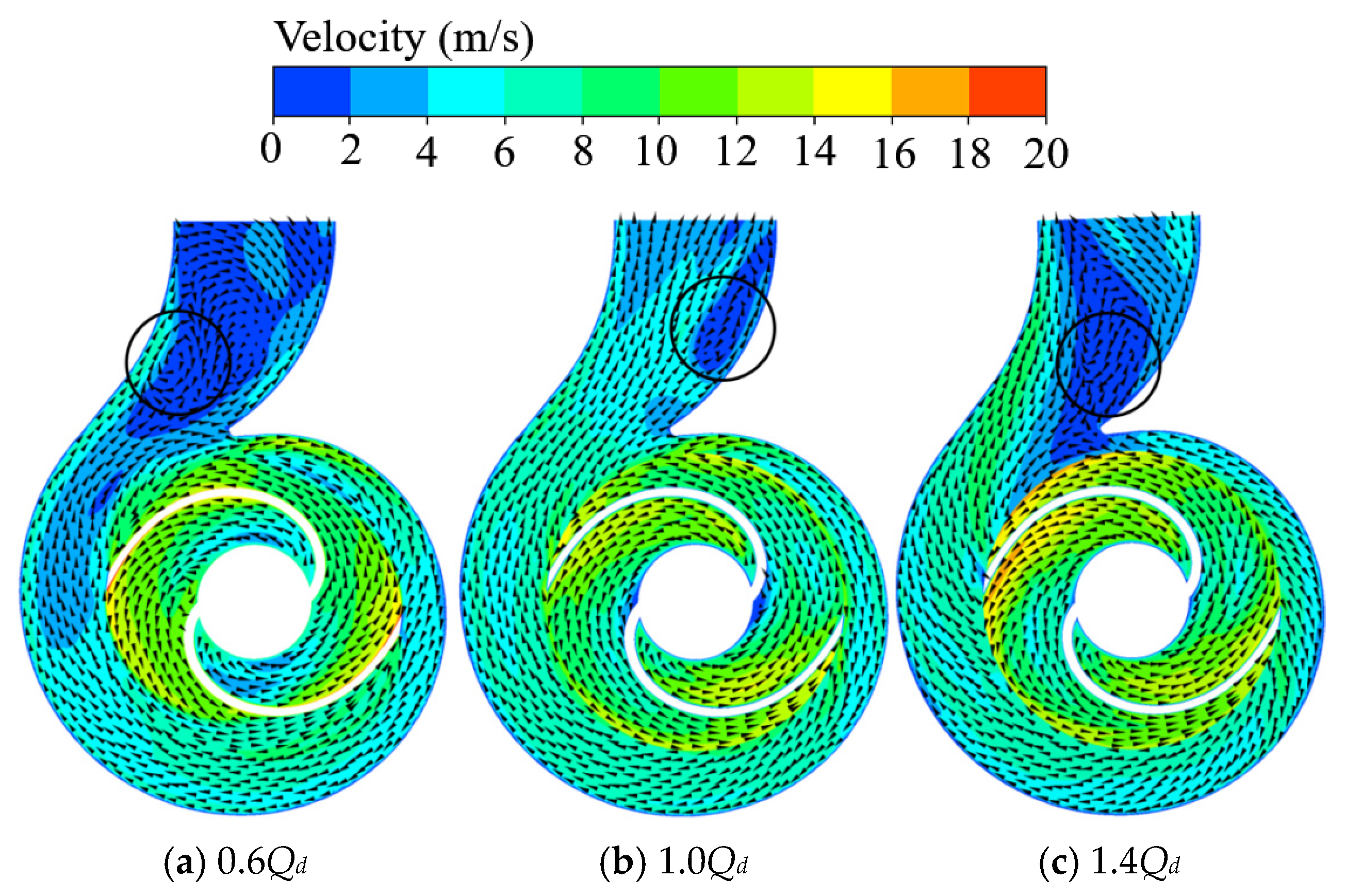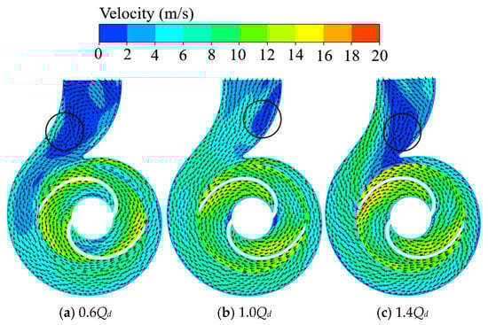 Figure 15. Velocity distribution in the volute mid-section under different flow conditions. The black circle highlights the vortex structure, and the small arrowheads represent the velocity vectors.