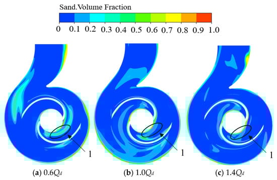 Figure 13. Solid-phase distribution in the radial mid-section of the sewage pump under different flow conditions.