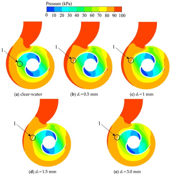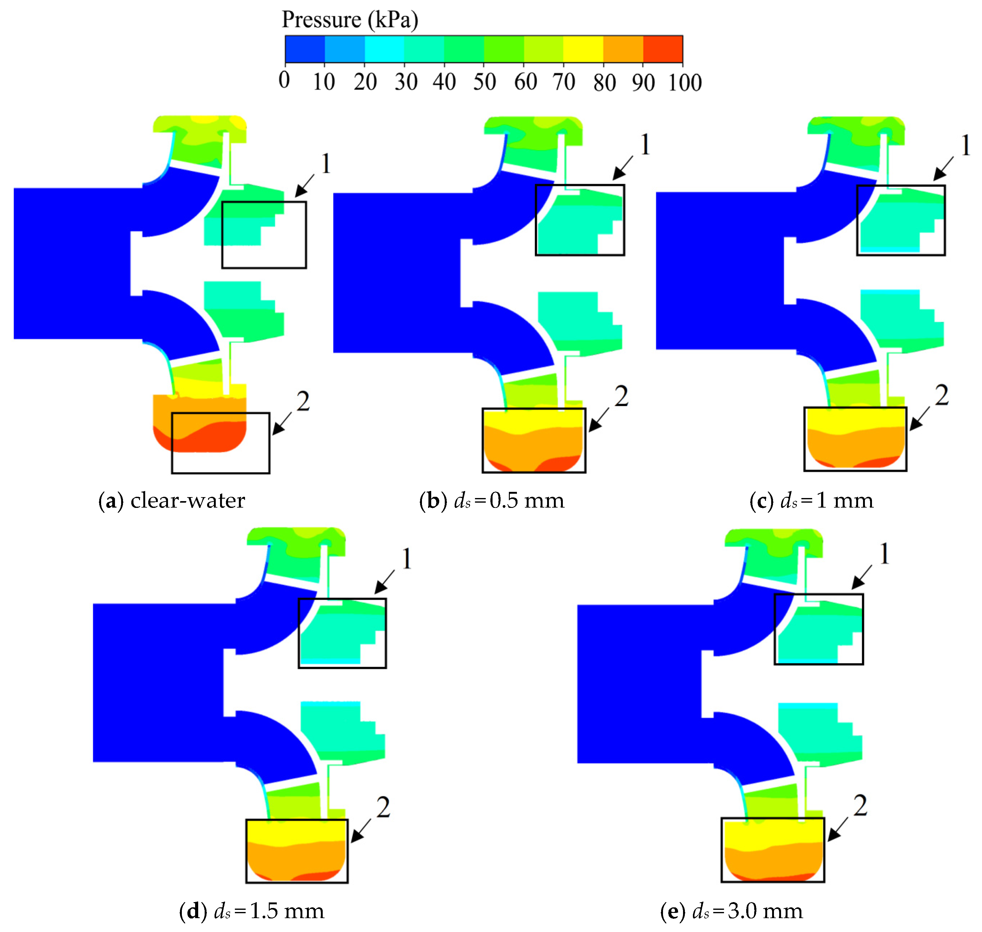 Figure 17 shows the pressure contour plots of the radial mid-section of the sewage pump under the 1.0Qd flow rate for the clear water condition and the conditions with particle diameters (ds) of 0.5 mm, 1.0 mm, 1.5 mm, and 3.0 mm. As indicated in the figure, compared with the single clear water condition, after adding solid particles into the fluid, the pressure distribution gradient in the section increases significantly. This is primarily attributed to the increased energy consumption caused by the solid–liquid interaction. The fluid transfers pressure energy to the solid particles to accelerate them, resulting in a steeper pressure gradient. Under the rated flow rate, the overall pressure distribution pattern inside the pump is similar. When the particle diameter increases from 1 mm to 3 mm, the pressure in the rear cavity gradually decreases, while the pressure in the volute channel changes slightly. The presence of solid particles increases the pressure difference between the rear cavity (Zone 1) and the volute channel (Zone 2). The increase in this pressure difference will directly enhance the axial force on the impeller, which may exacerbate the bearing load and the risk of wear.